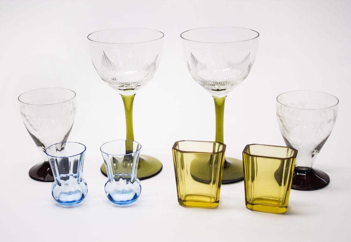 3263. 6 verres sur pieds verts et 6 verres bas sur pieds grenat à décor géométrique et 6 gobelets à liqueur bleu azur