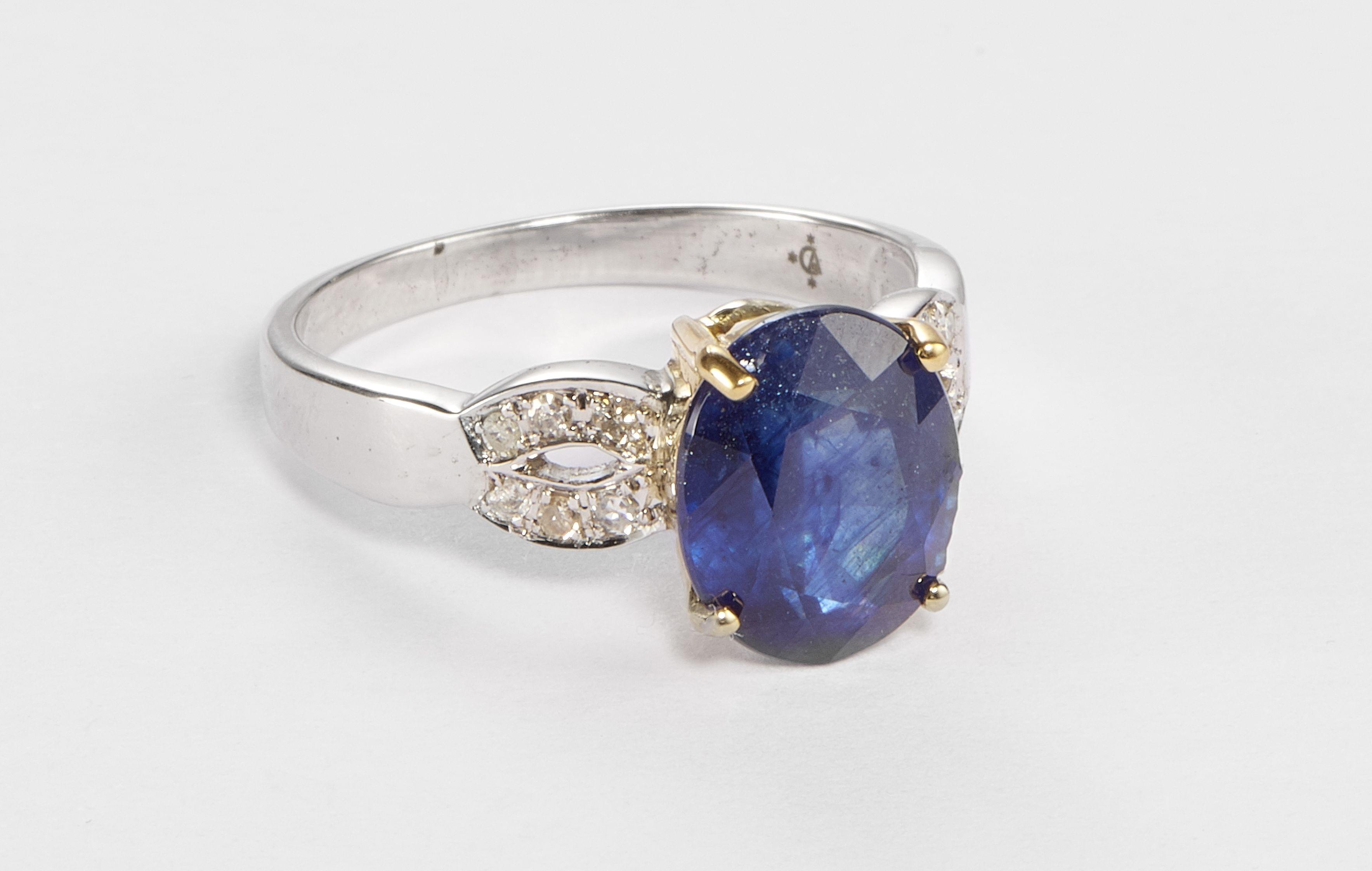 3230. 6235*Bague sertie d'un saphir taille ovale épaulé de diamants