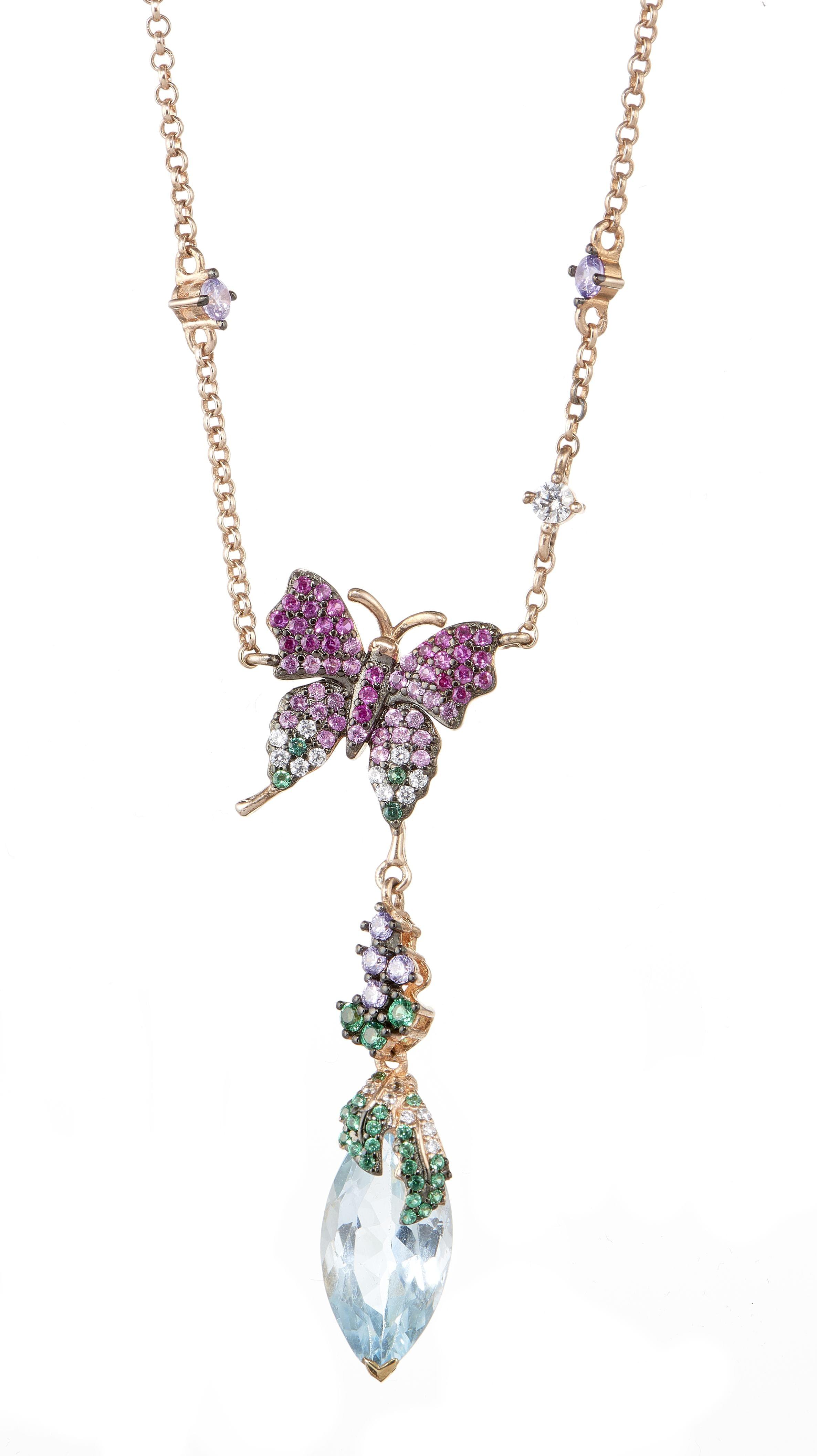 4228. 6604 -*Collier à motif de papillon retenant une topaze bleue taille marquise (env. 5 ct) et pavée de pierres d'imitation multicolores