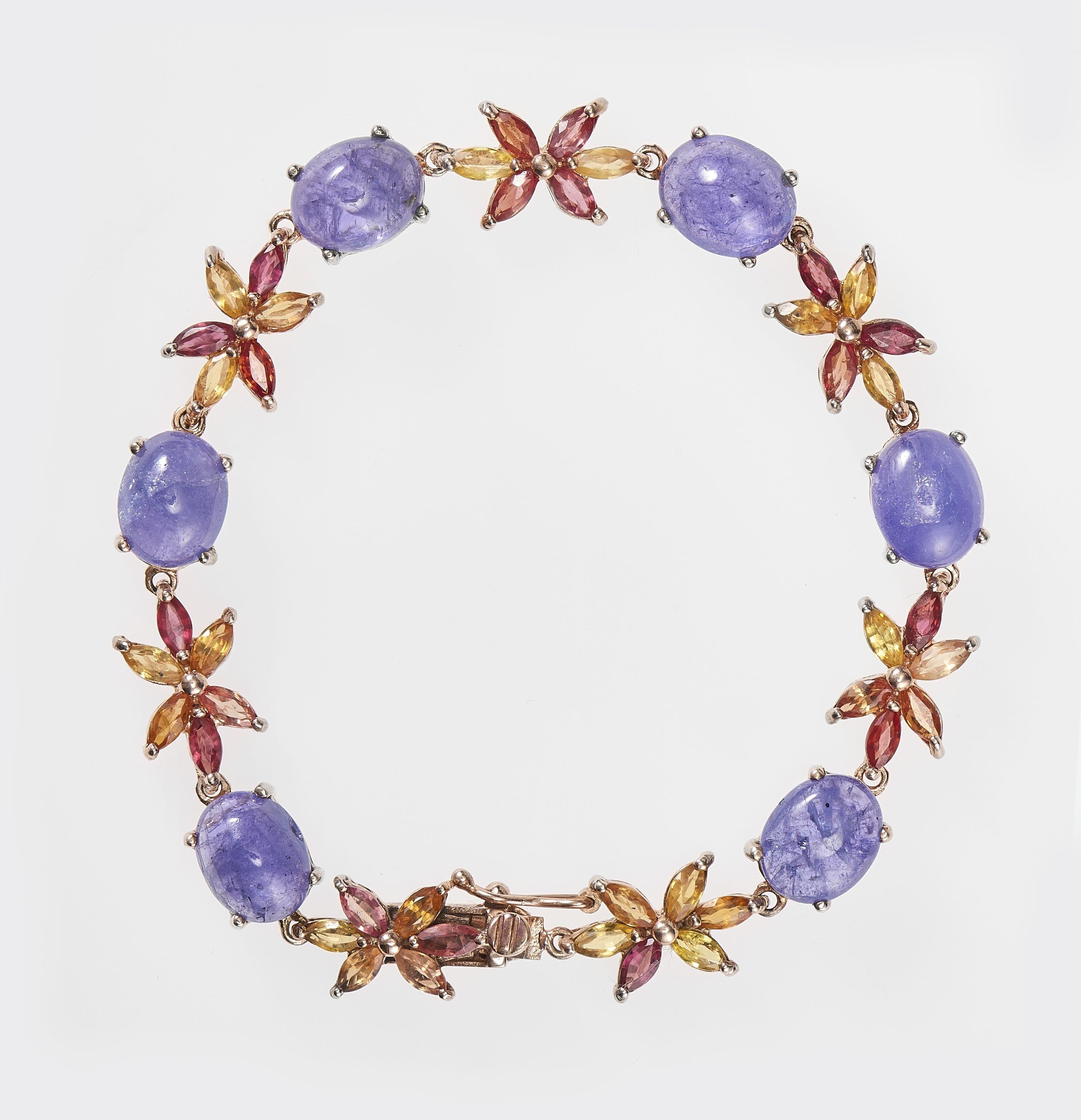 3466. *6722 Bracelet serti de tanzanites taille cabochon (env. 20 ct) rehaussées de saphirs orange formant des motifs de fleurs