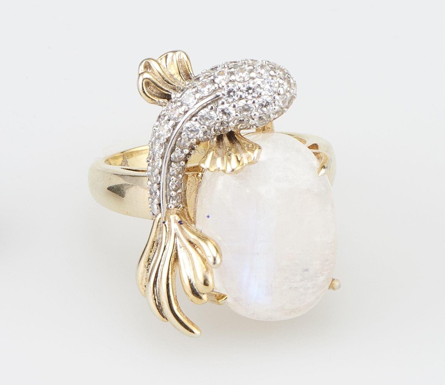 3229. *6724 Bague sertie d'une pierre de lune taille cabochon ovale entourée d'un motif de poisson pavé de pierres d'imitation pour le diamant