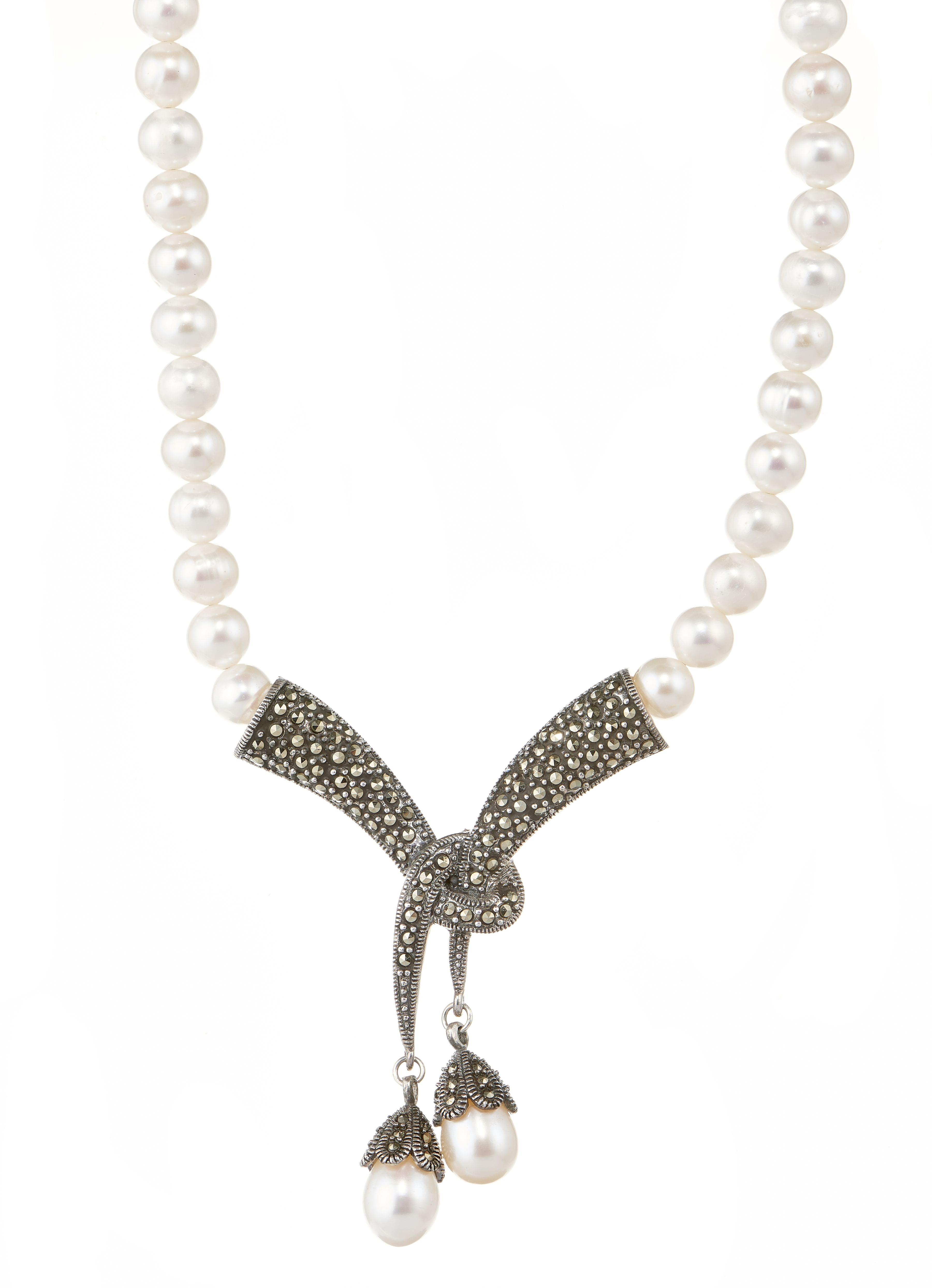 4229. 6926 -*Collier de perles d'eau douce centré d'un motif de nœud pavé de marcassites et retenant deux perles en pampille