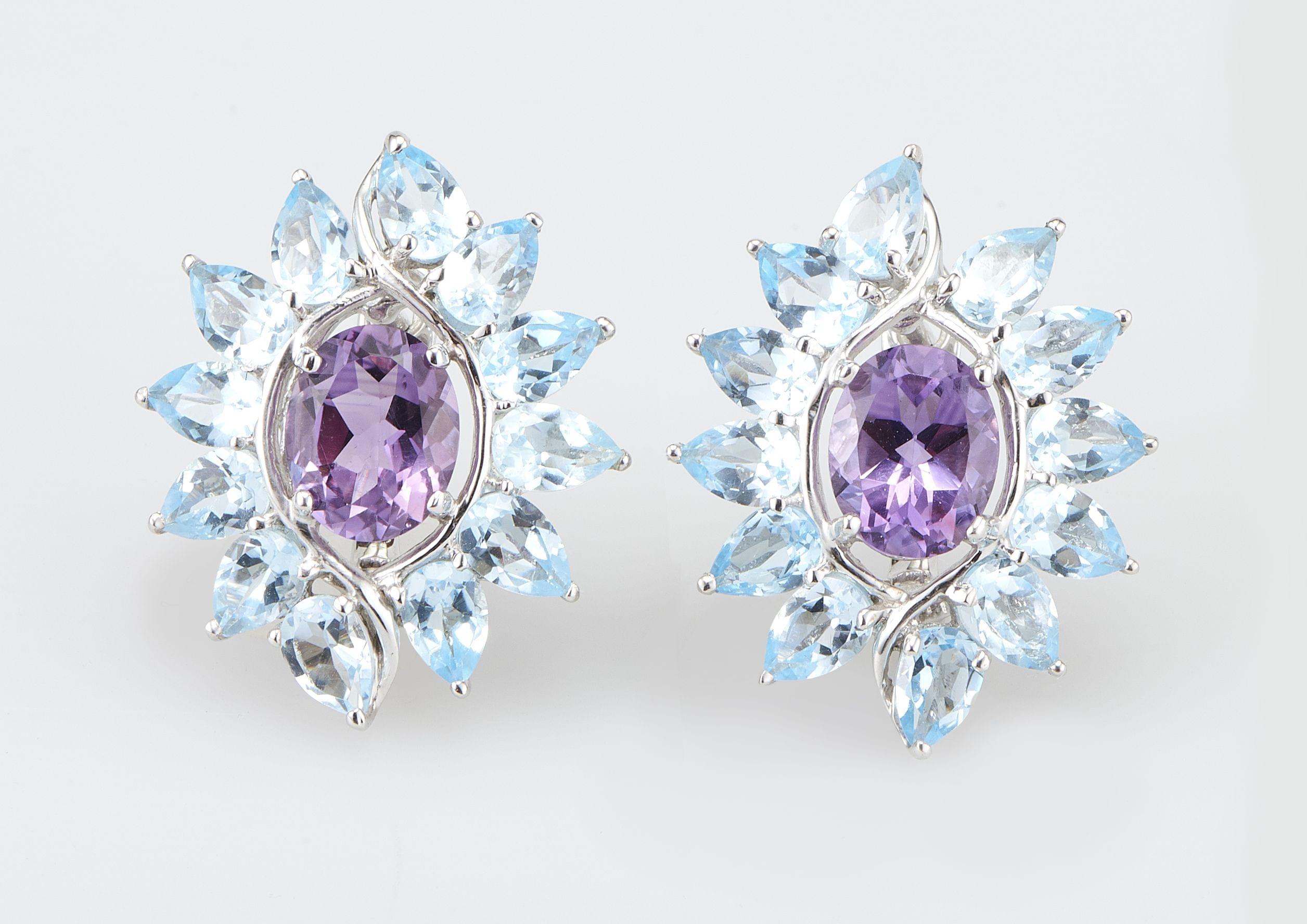 3307. *6937 Boucles d'oreilles centrées d'améthystes taille ovale (env. 4 ct) entourées de topazes bleues taille poire (env. 7 ct)