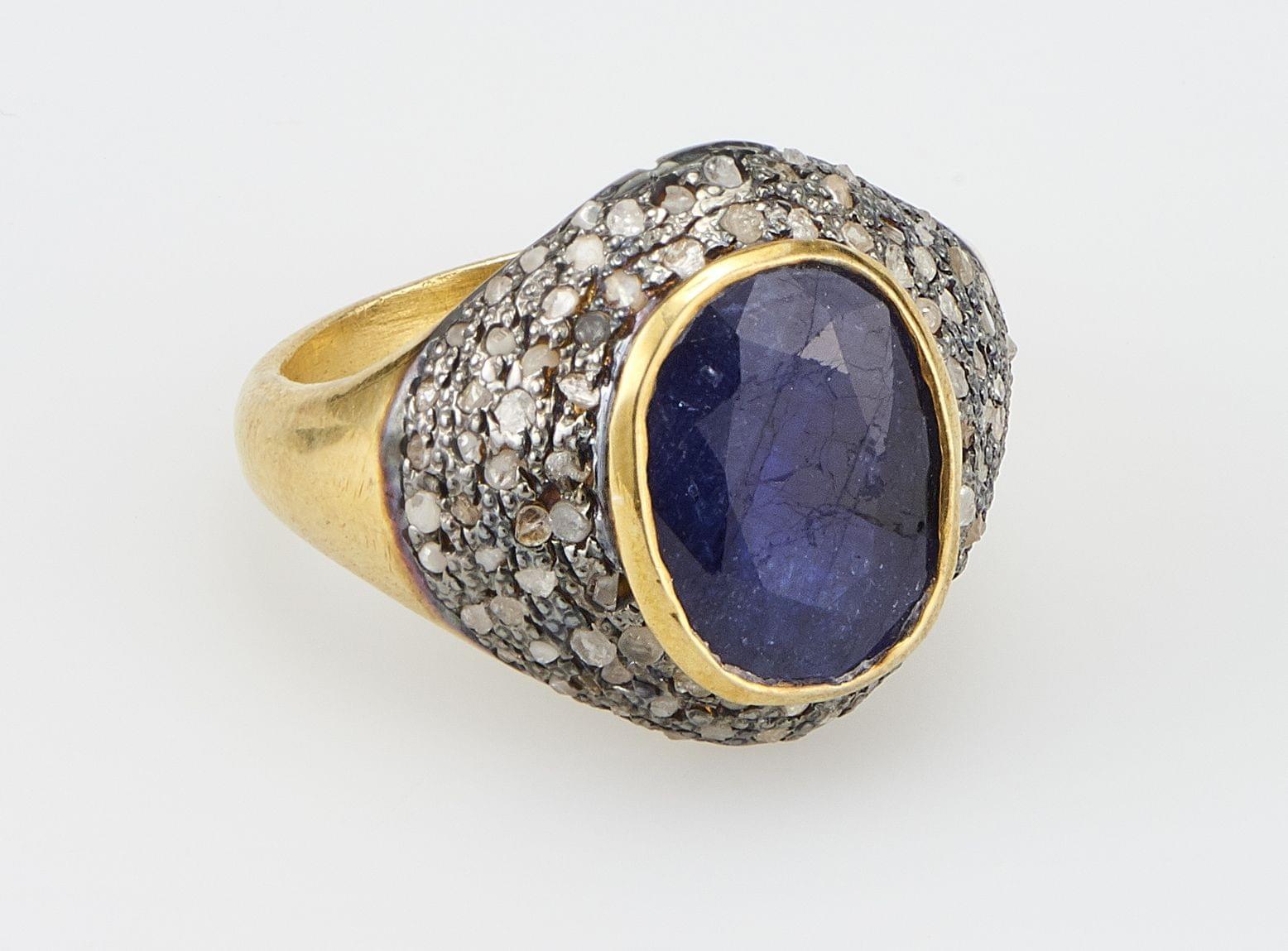 3465. *7046 Bague sertie d'un saphir taille ovale glass-filled (env. 7,4 ct) rehaussé de roses de diamants (env. 2 ct)