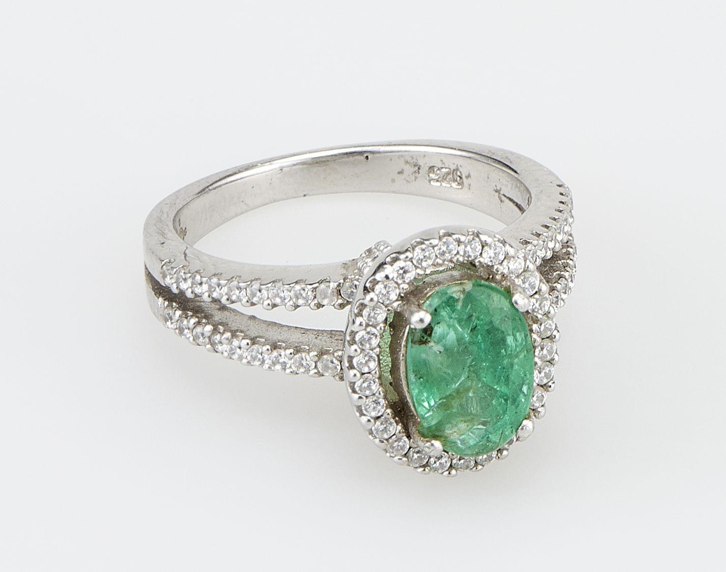 3337. *7049 Bague sertie d'une émeraude taille ovale (env. 1,8 ct) entourée de pierres d'imitation pour le diamant