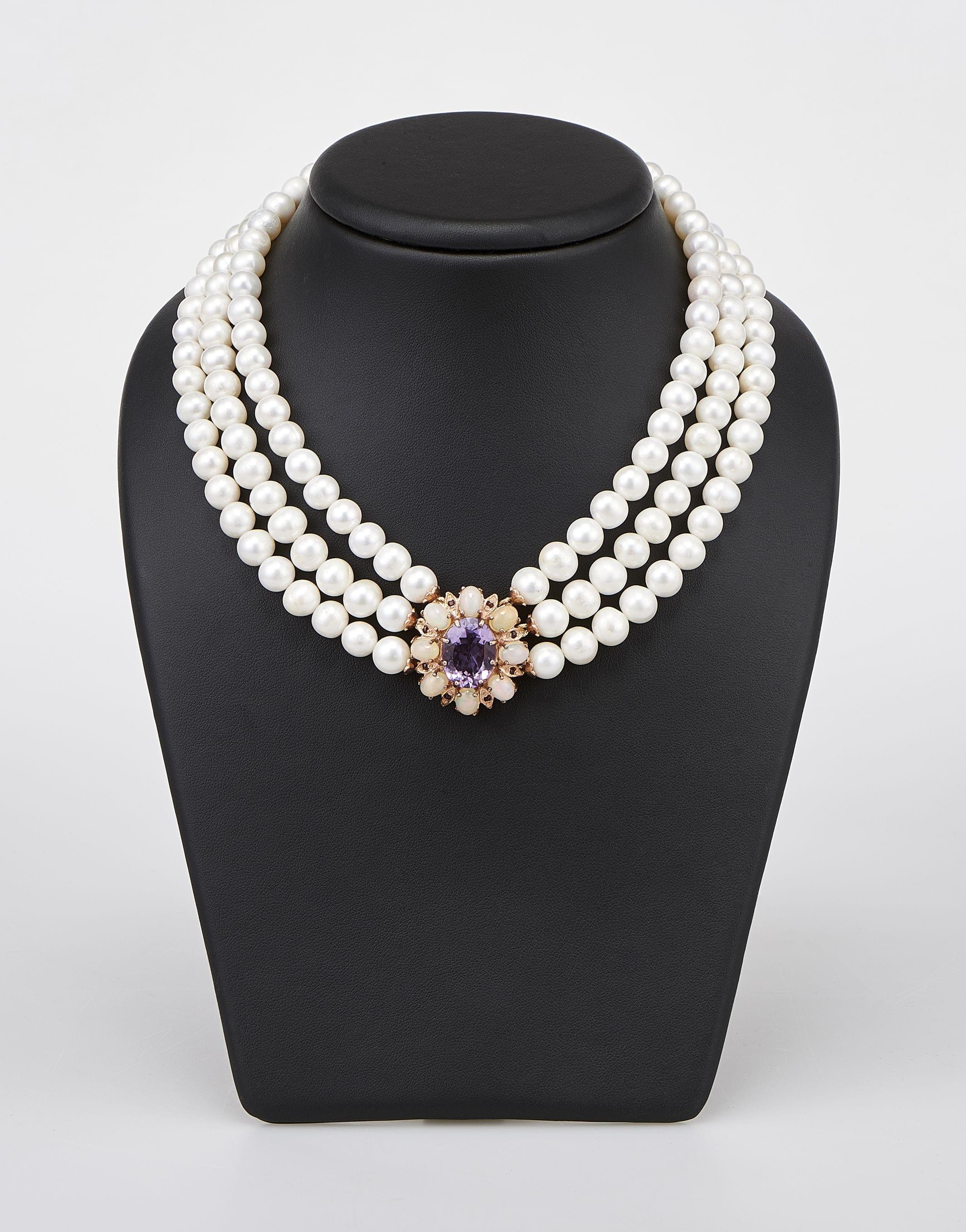 3379. *7139 Collier à trois rangs de perles (D env. 8 mm) retenant un motif central serti d'une améthyste taille ovale (env. 6,5 ct) entourée d'opales et de grenats