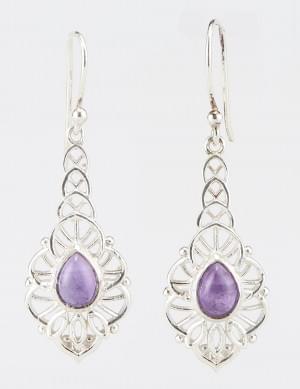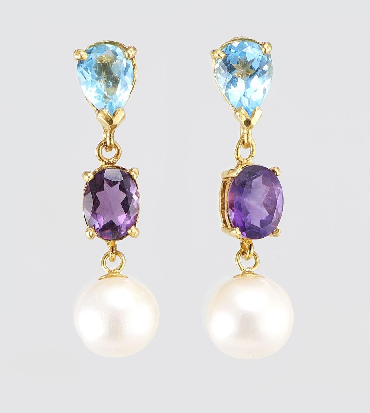 L'une retenant des perles (D env. 10 mm) rehaussées de topazes taille poire (env. 3 ct) et d'améthystes taille ovale (env. 3 ct), l'autre ajourée sertie d'améthystes taille poire (env. 1,2 ct)