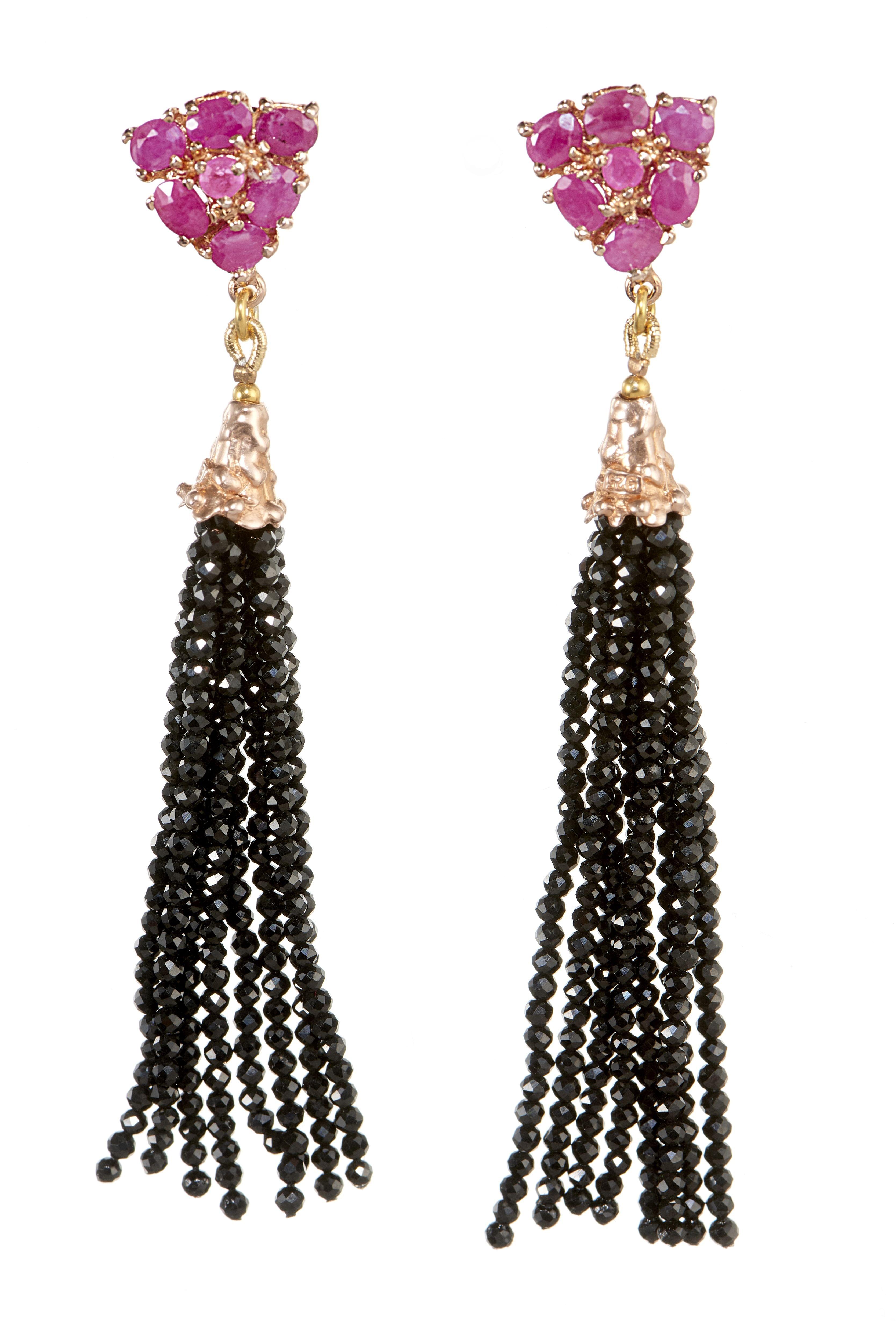 4162. 7150 -*Boucles d'oreilles en pampilles composées d'un motif pavé de rubis retenant des lignes de spinelle noir