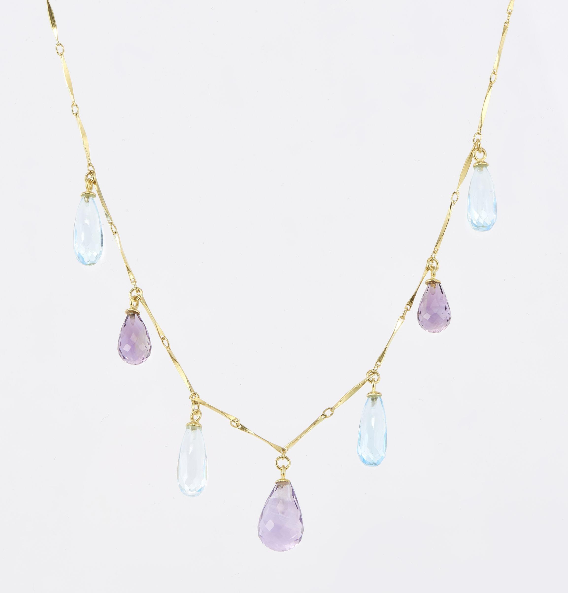 3170. 7161*Collier à maille bâton retenant des gouttes d'améthystes et de topazes bleues facettées