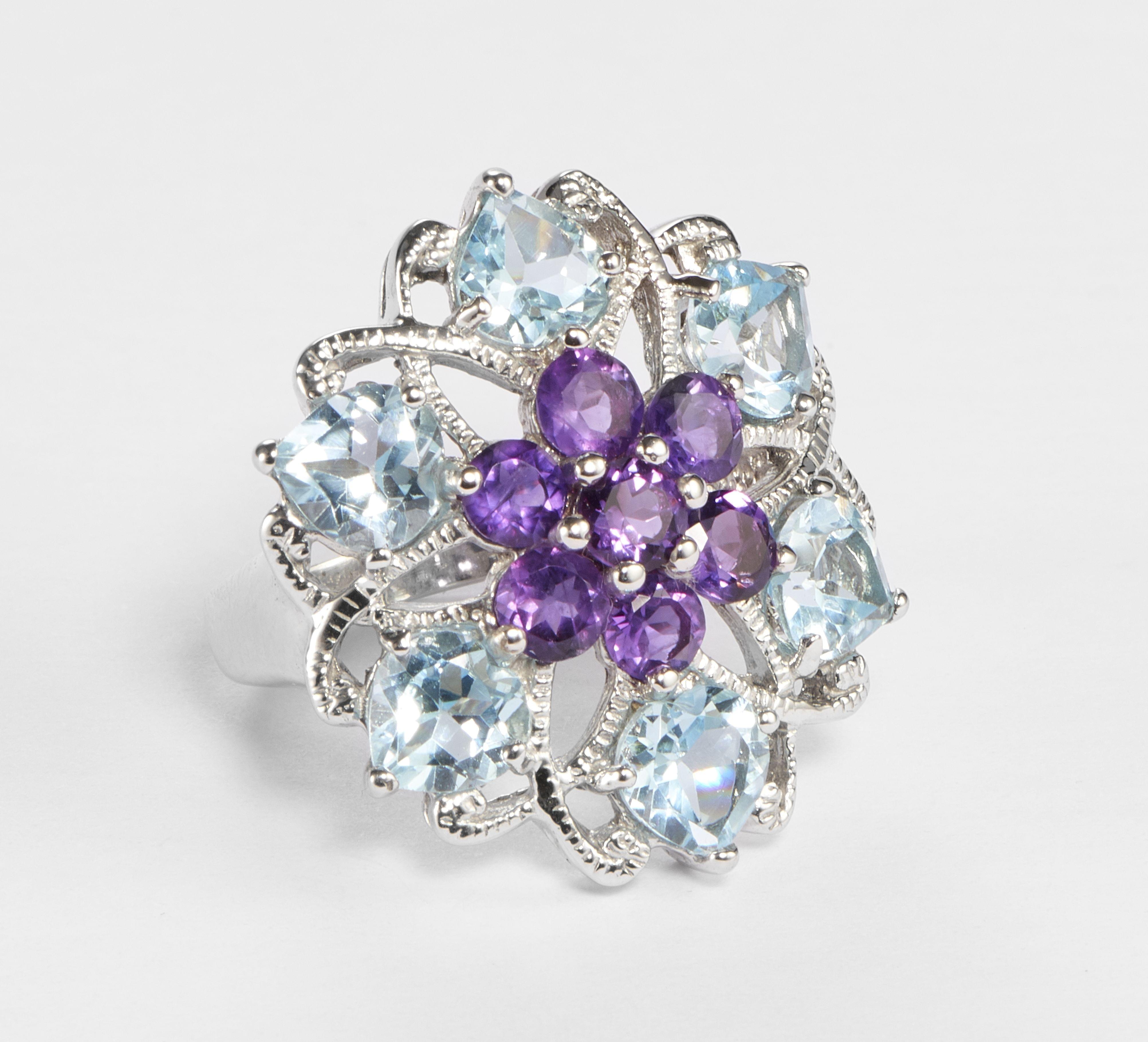 3155. 7192*Bague à motif de fleur ajourée centrées d'améthystes taille brillant et rehaussée de topazes bleues taille coeur