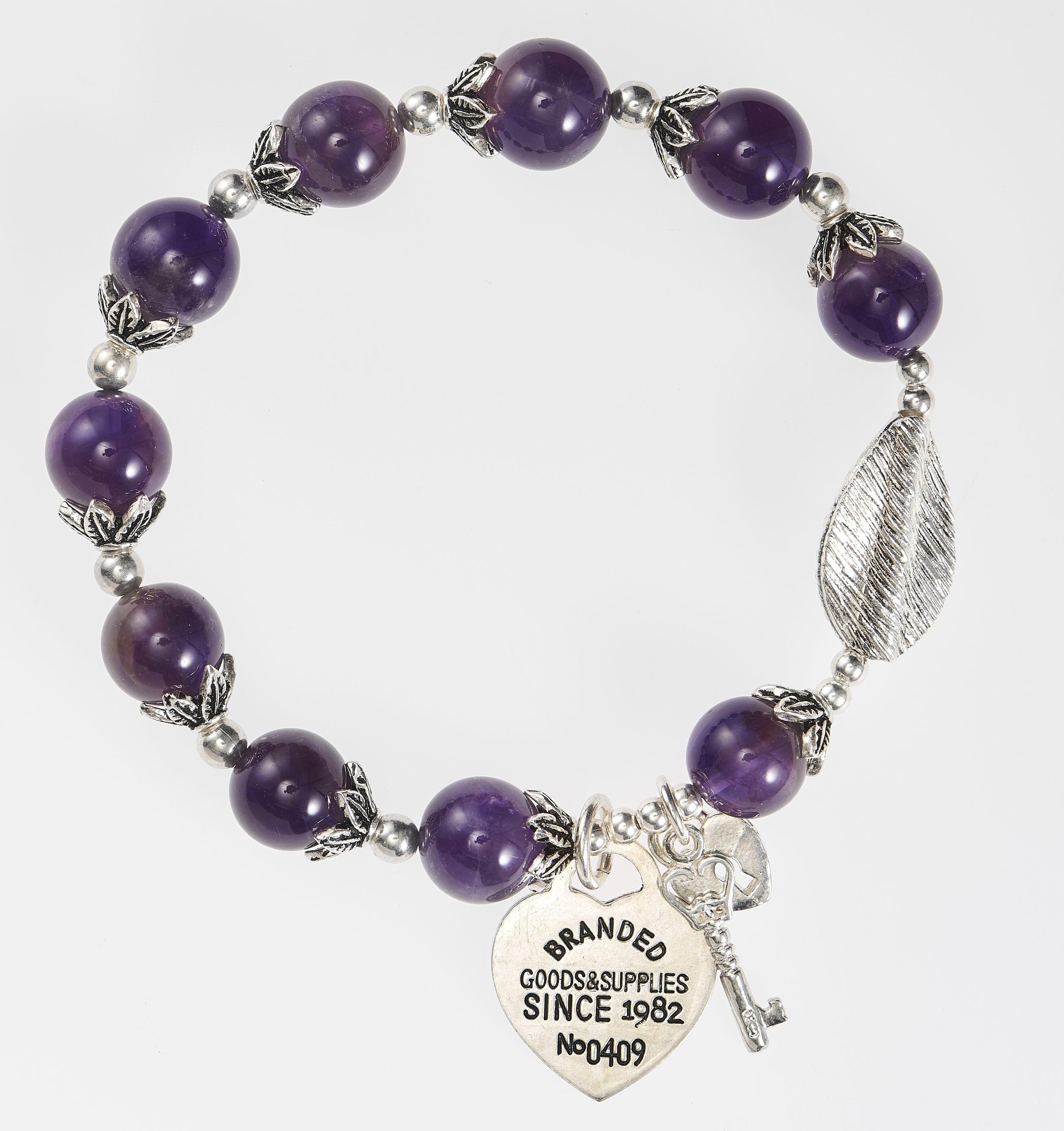 3193. *7193 Bracelet de perles d'améthystes ponctuées d'un motif de feuille et de pendeloques à motifs de cœurs et d'une clé