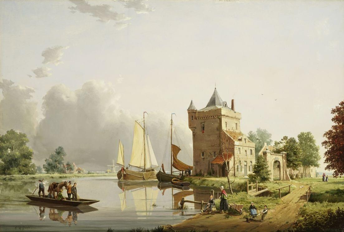 Scène animée au bord de l'eau, huile sur panneau signée, 54x78 cm