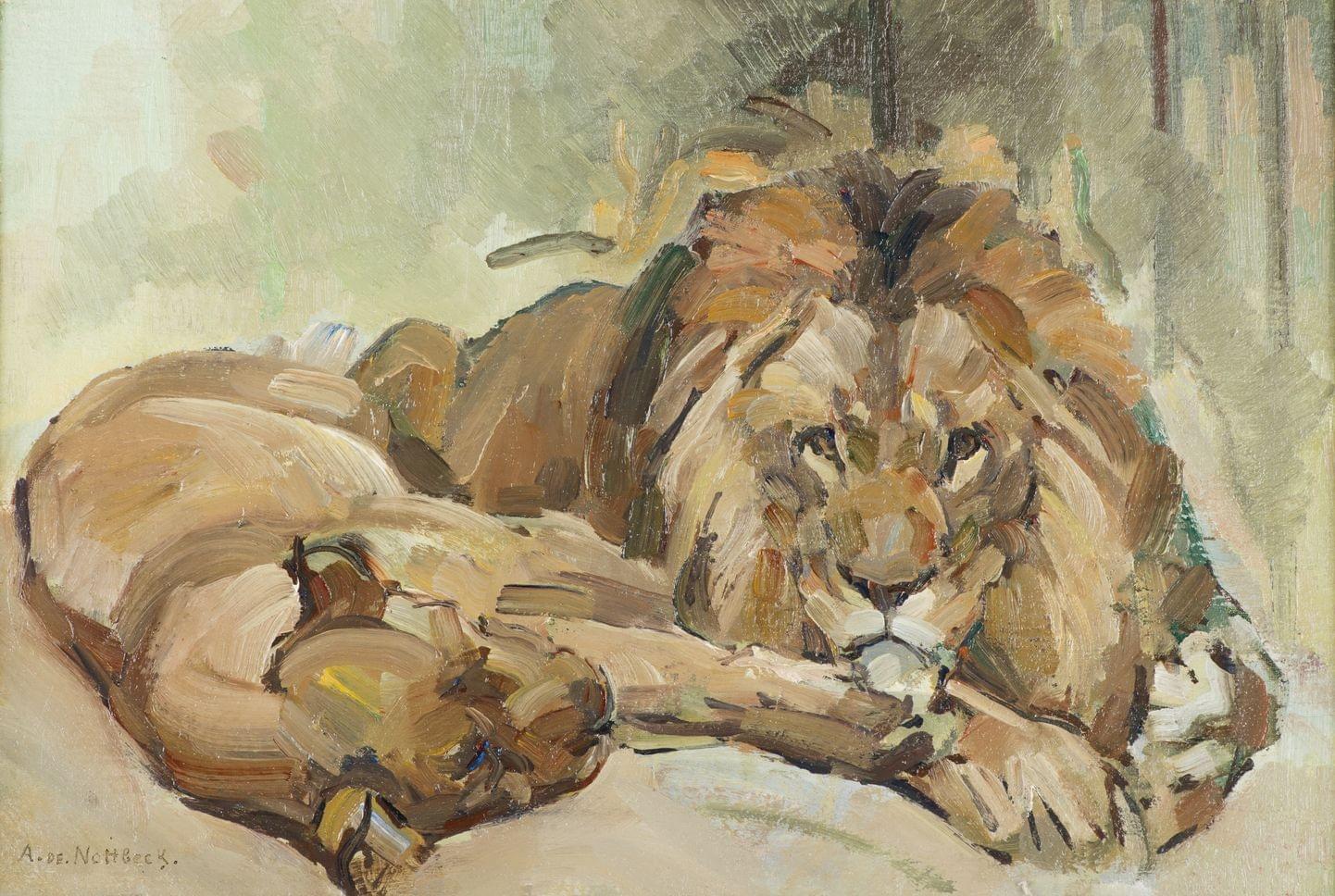 Lion et lionne couchés, huile sur carton, signé, 33x48 cm