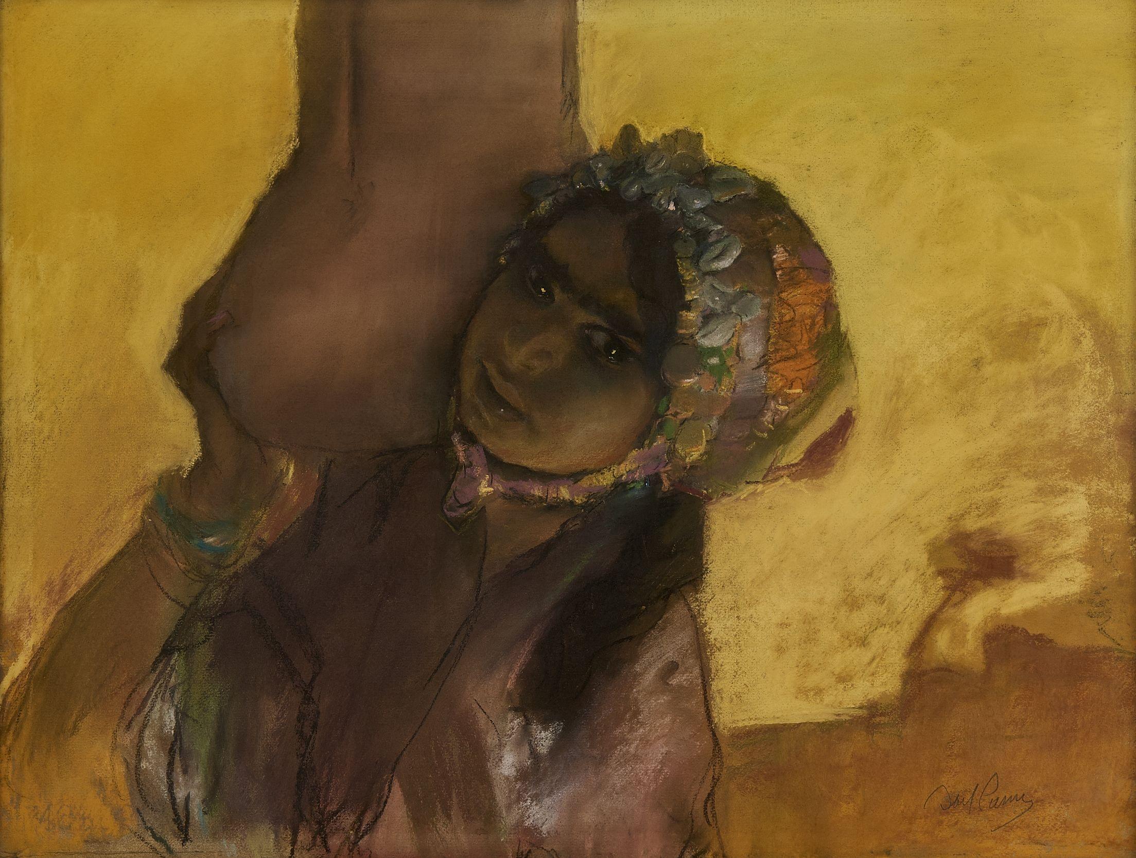 Jeune fille nord-africaine portant une cruche, pastel, signé, 45x55 cm