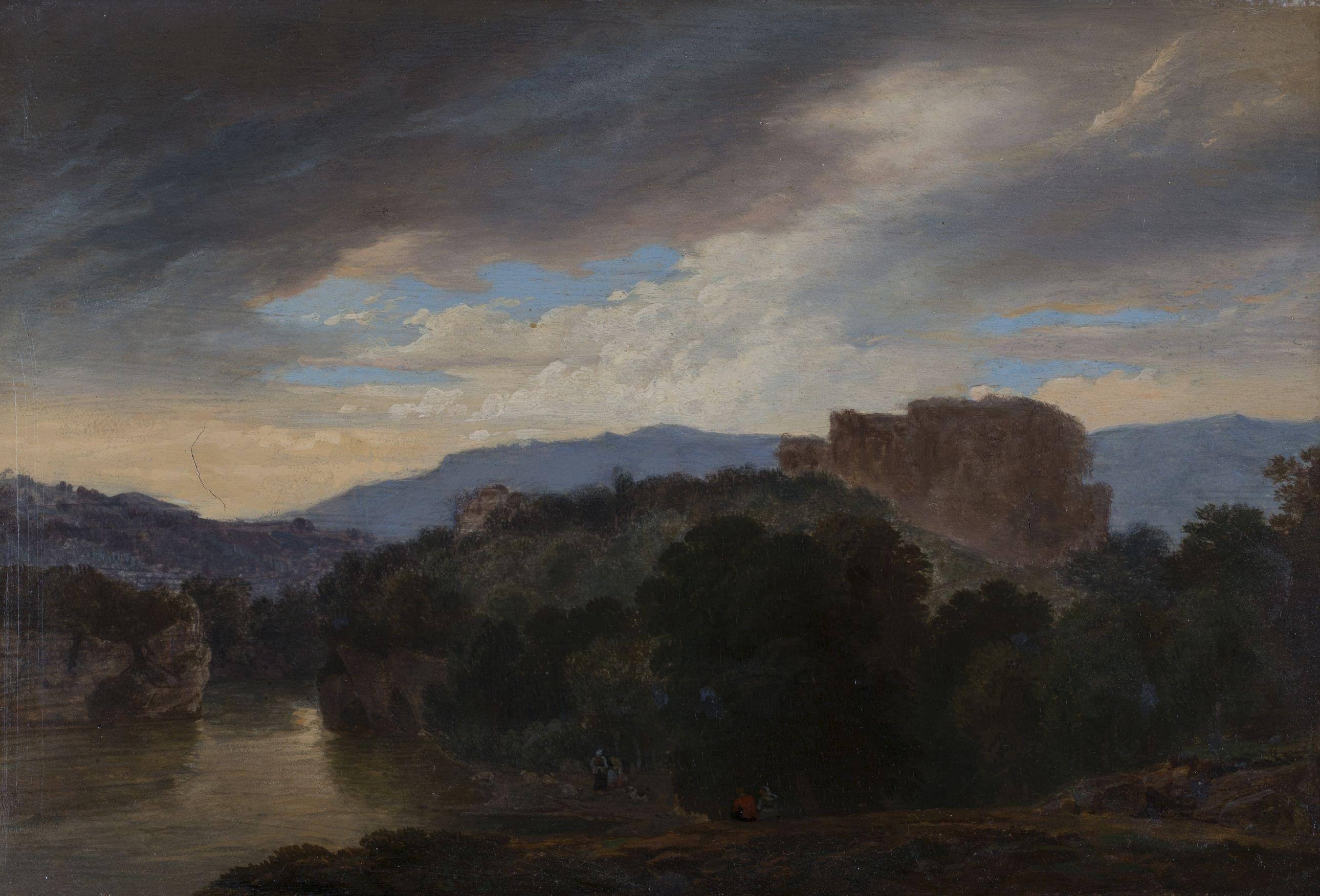 Paysage animé, huile sur panneau non signée, inscription à l'encre au verso: "Ce tableau m'a été donné par mon grand-père Adam Töpffer le 1er janvier 1839, Genève, David Duval, 7 Nov. 1876", 19x28 cm. Provenance: David Duval-Mennet, Henri Duval-Brown, galerie Catherine van Notten, collection particulière Genève