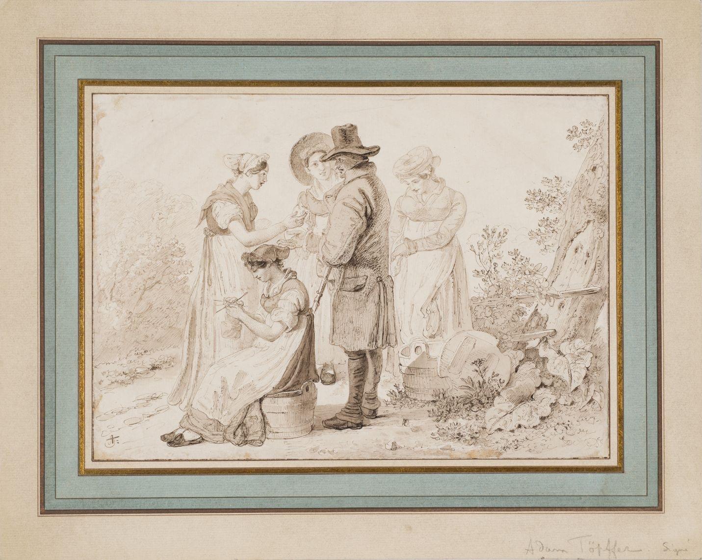 Rencontre galante, caricature, lavis d'encre, monogrammé, 8,5x13...