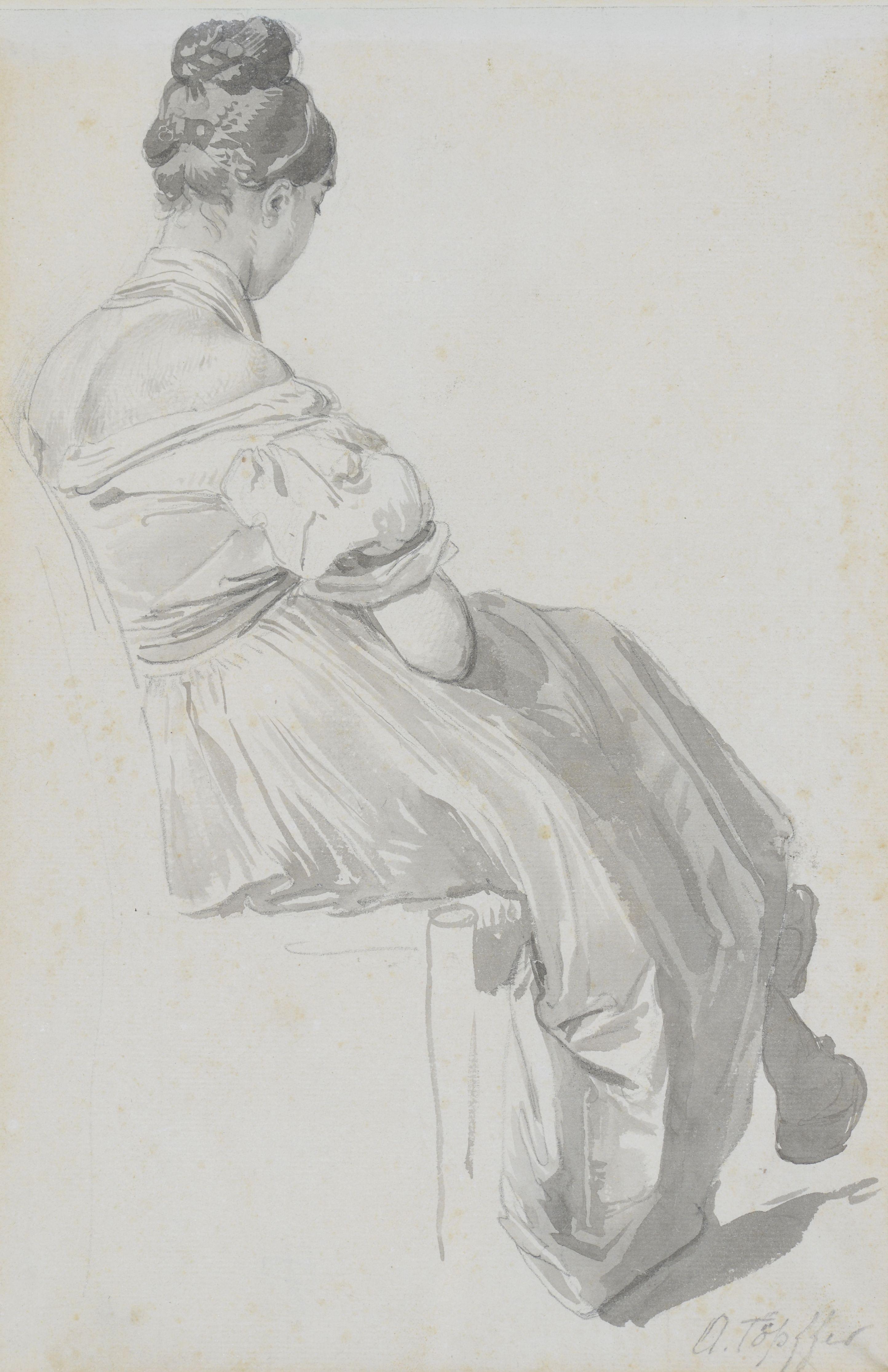 Femme de dos assise sur une chaise, lavis à l'encre noire sur papier, signée, 20x18cm