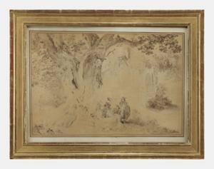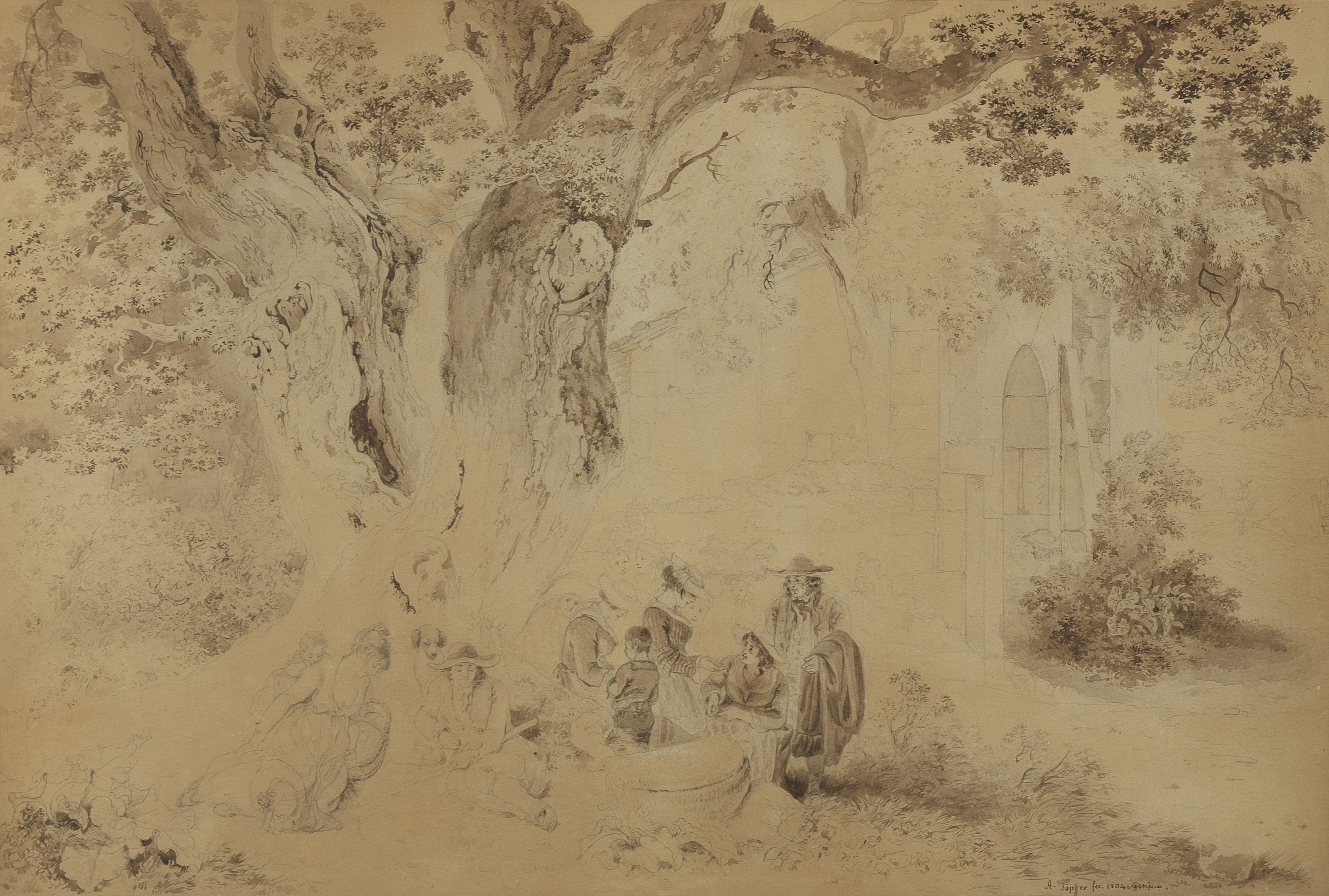 Groupe de personnages, lavis, daté 1804, 45x67 cm