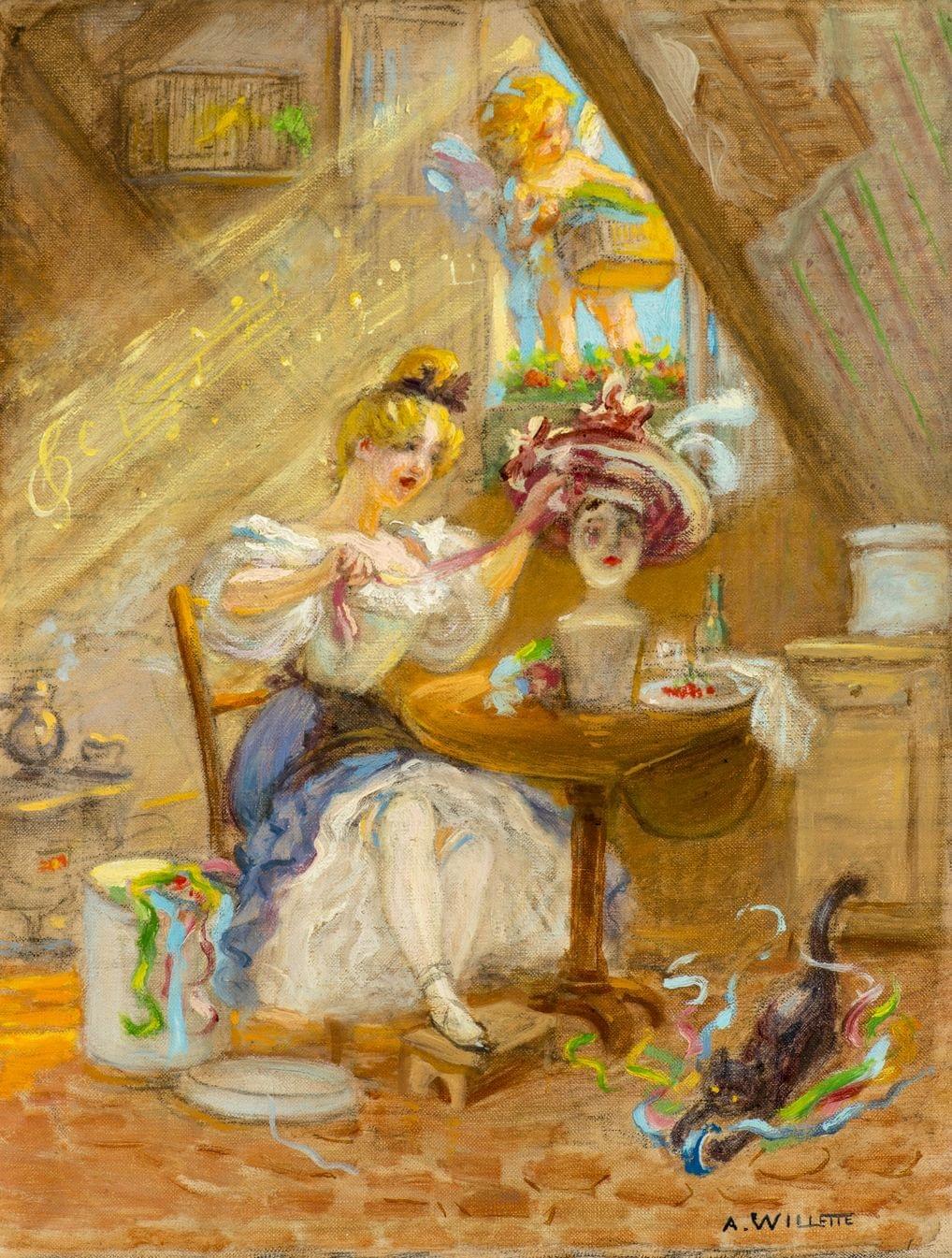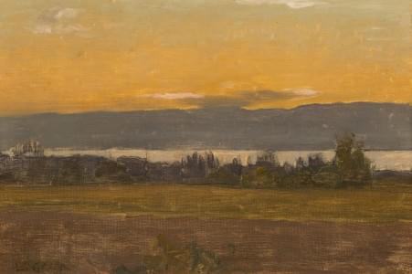 Coucher de soleil à Yvoire, huile sur toile marouflée sur carton...