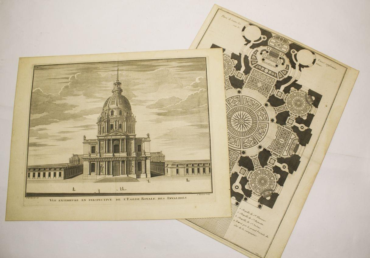 Façade et plan au sol des Invalides, gravures, XVIIIe s, 34,5x44 cm et 50x36,5 cm