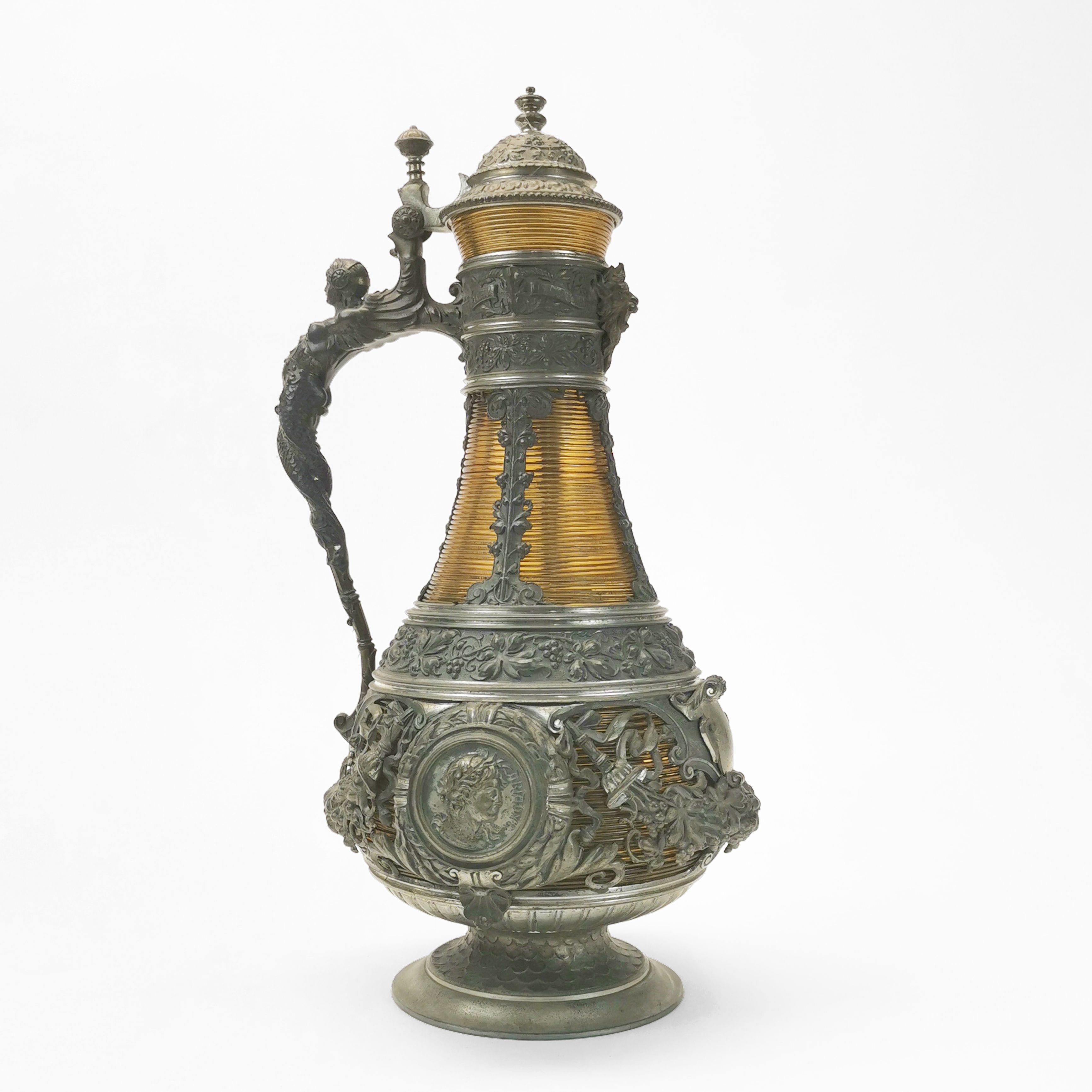 Etain et verre fumé à décor de médaillons de Bacchus, H 36 cm