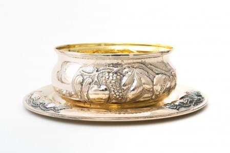 645. Coupe, six gobelets et plateau pour le Kiddush à motif de pampre...