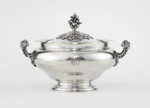 103. Soupière à anses masque de femme et fretel bouquet entouré d'aca...