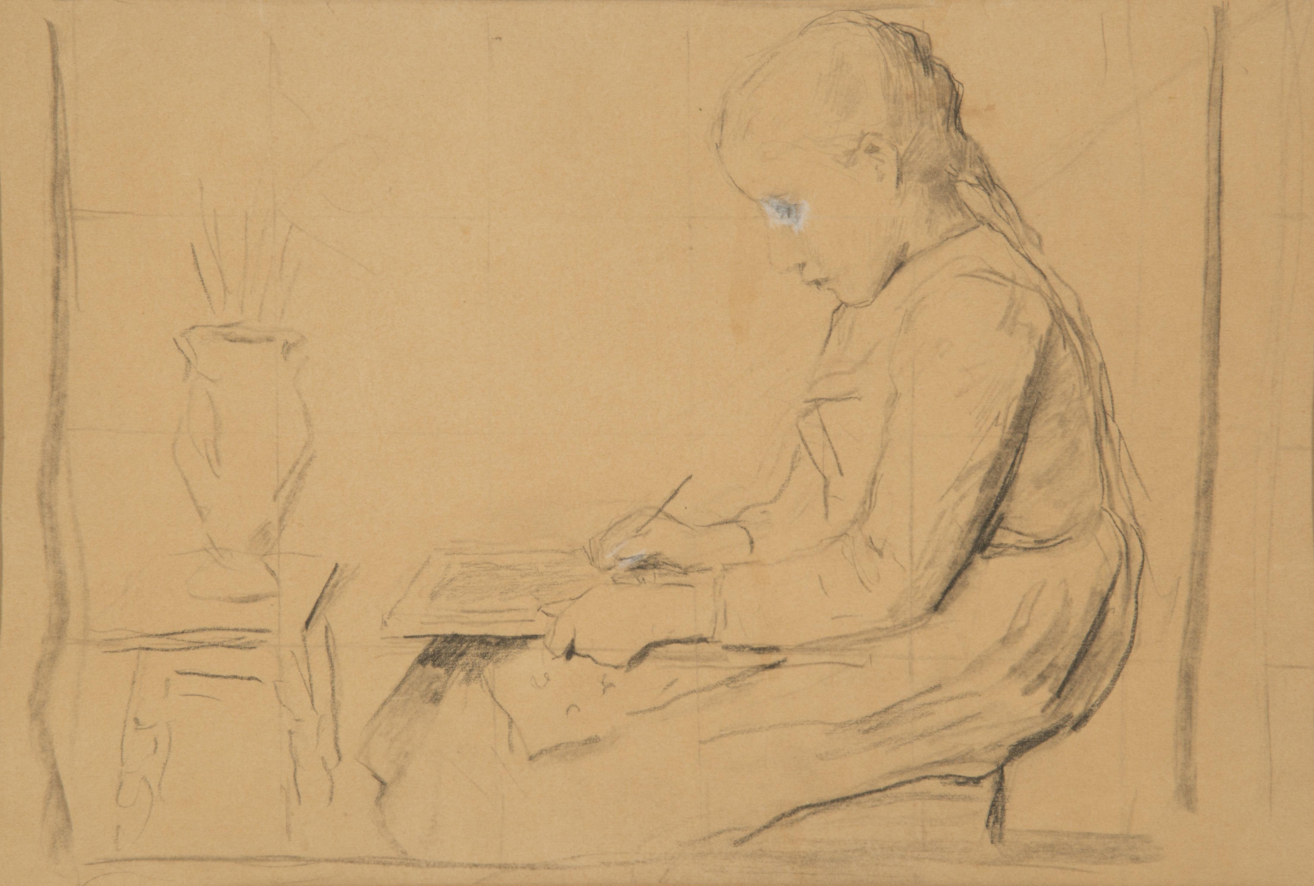Jeune fille dessinant, fusain sur papier, 24x36 cm. Au dos, attestation signée par Elisabteh Oser petite fille d'Albert Anker et datée du 13 janvier 1961