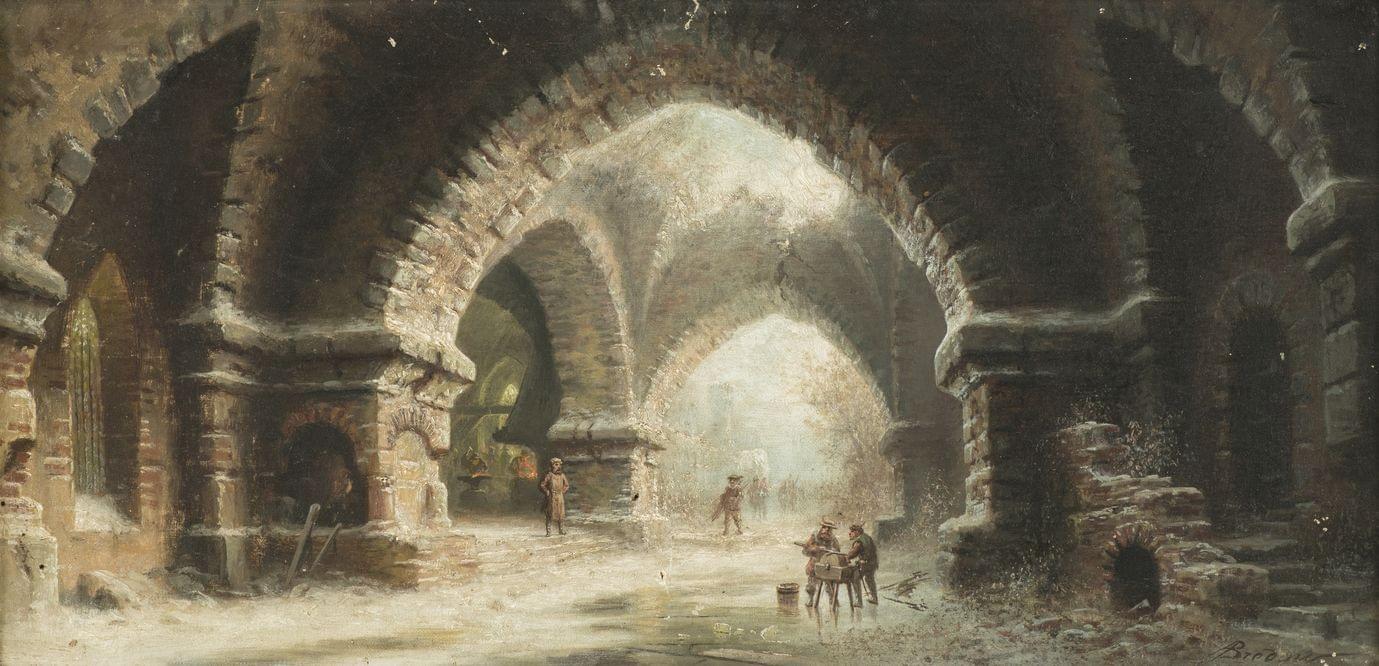 La forge en hiver, huile sur toile signée, 36x68 cm