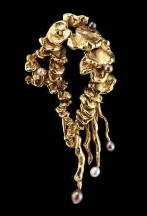 105. Gilbert Albert, broche ajourée stylisée sertie de petites perles...