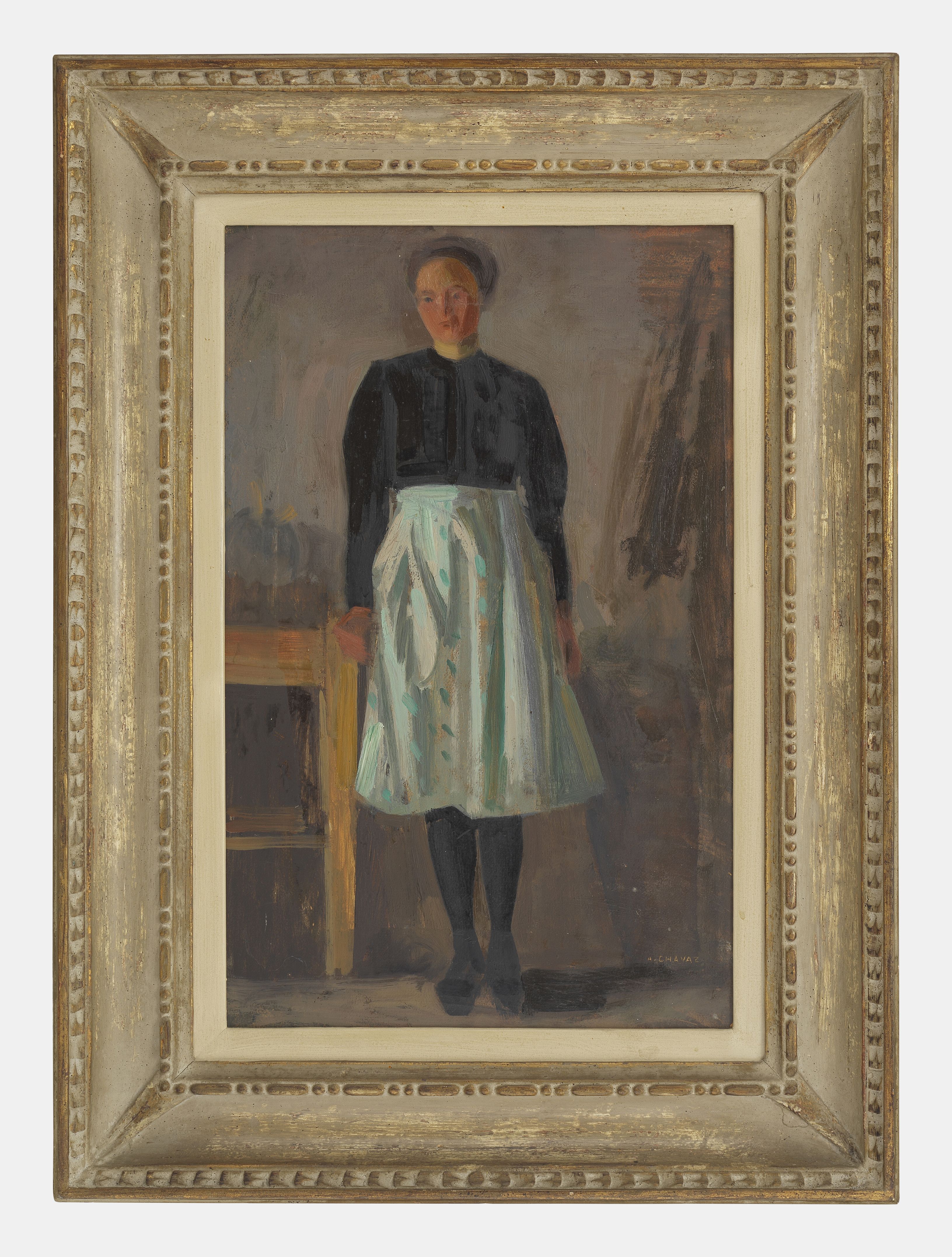 Portrait de femme au tablier, huile sur carton, signée, 55x35 cm