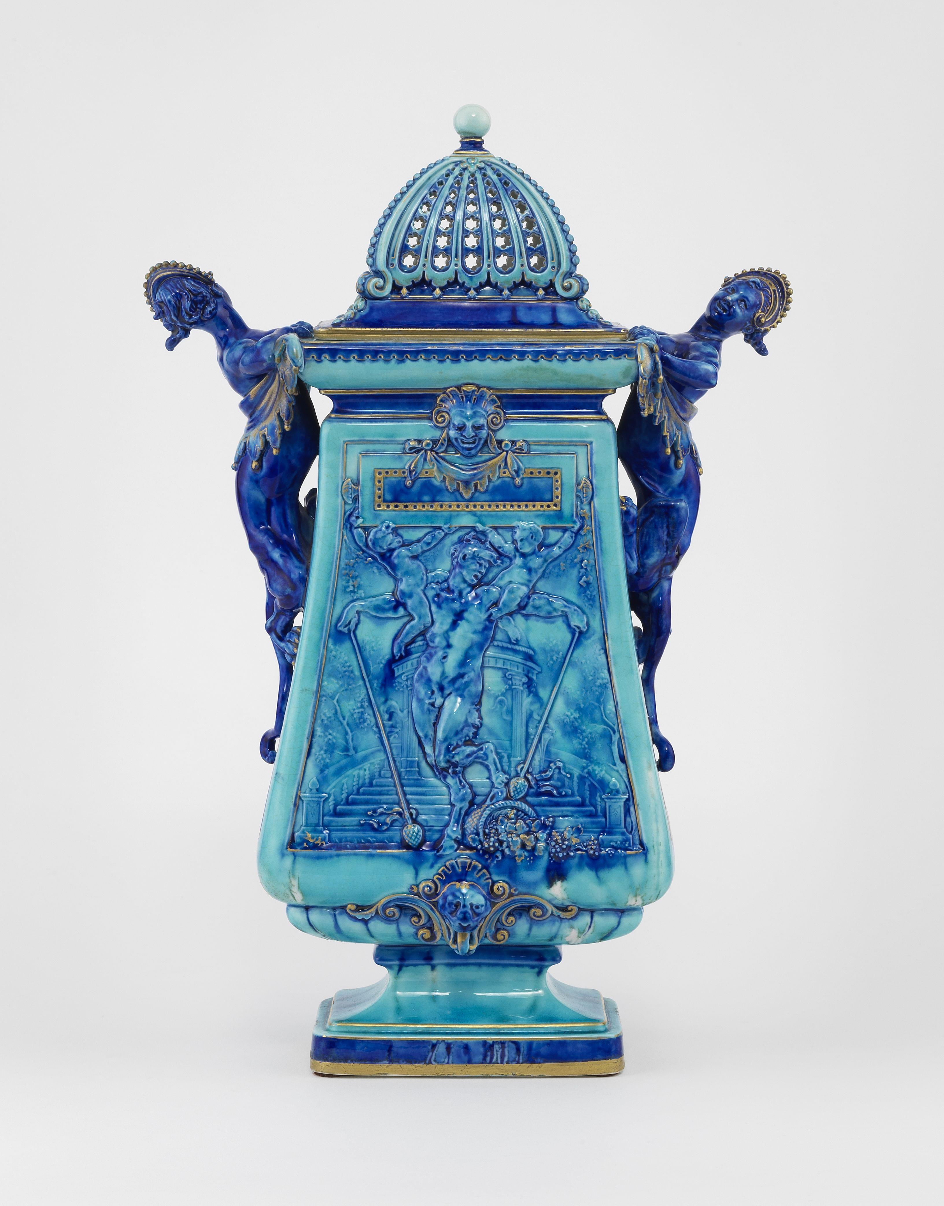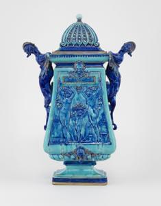 Vase à section rectangulaire à décor d'un satyre et nymphes dansant, anses chimères, couvercle en coupole ajourée, porcelaine dans les tons turquoise, marqué et signé, H 46 cm. Provenance: Galerie Camoin Demachy, Paris; couple d'amateurs en Suisse