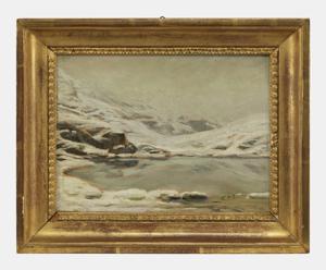 Lac de montagne en hiver, huile sur panneau, 17x23 cm