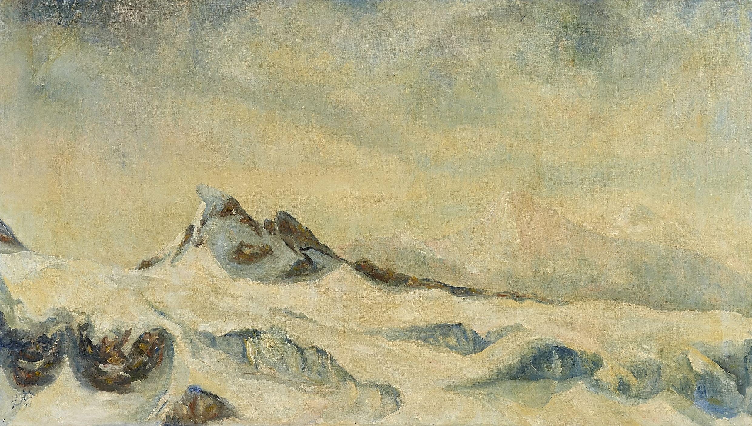 Cimes enneigées, huile sur toile, signée et datée 30, 80x140 cm