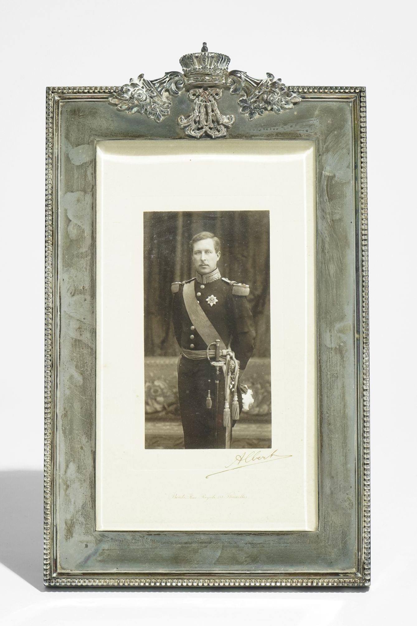 121. Albert Ier roi des Belges, photographie dans un cadre en argent sommé de son chiffre couronné