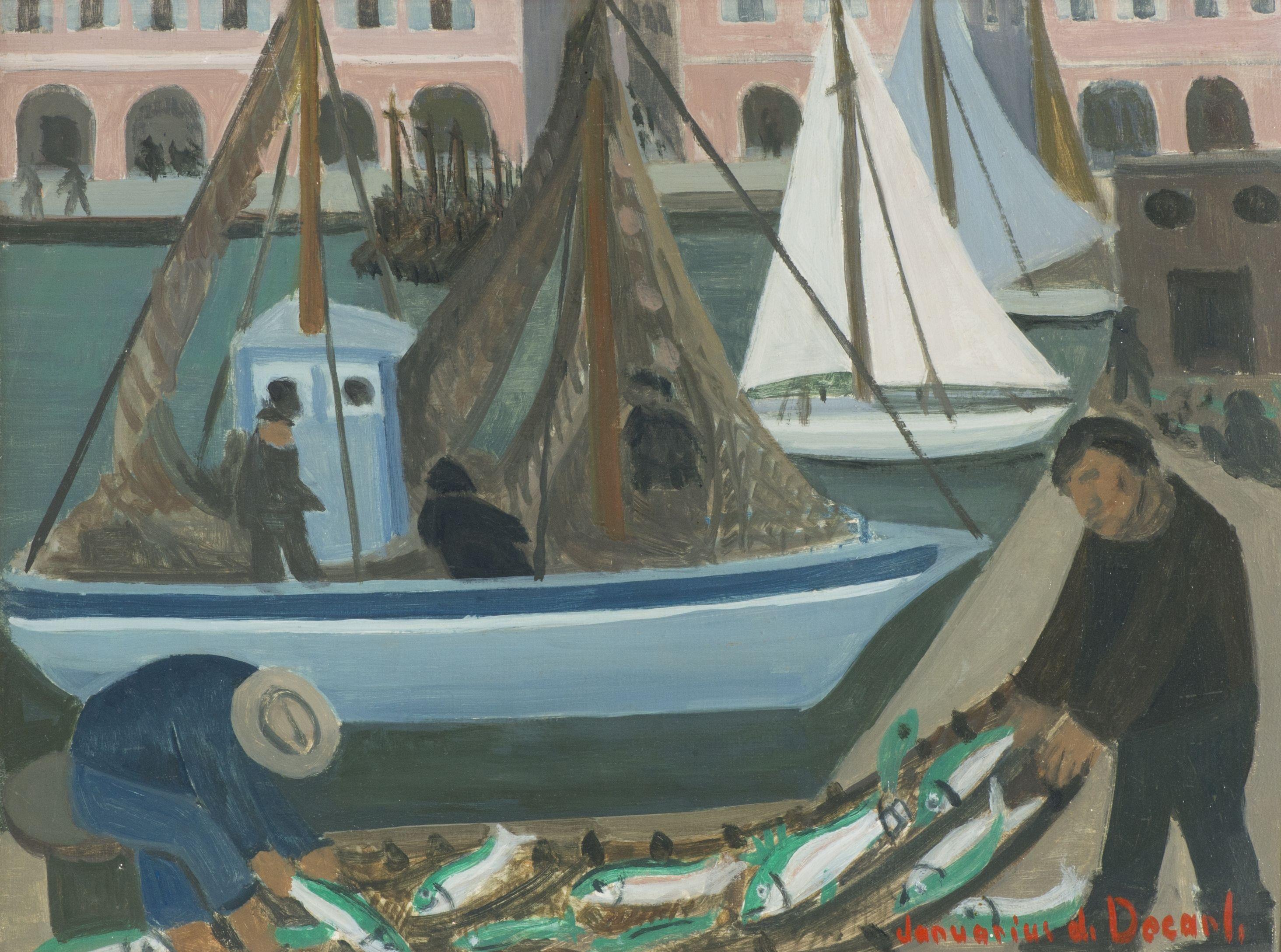 Retour de la pêche, huile sur toile, signée, 49x64 cm
