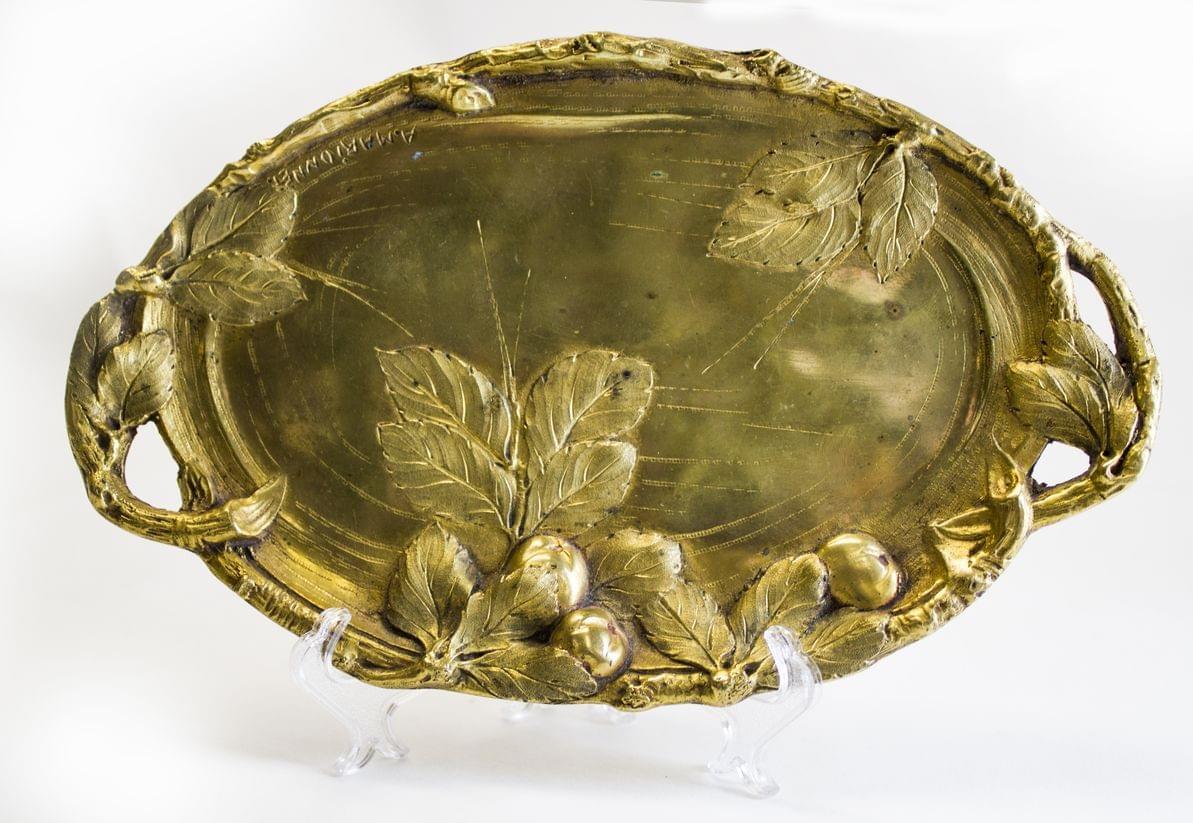 Petit plateau à décor de feuillages, bronze doré, signé, L 24 cm