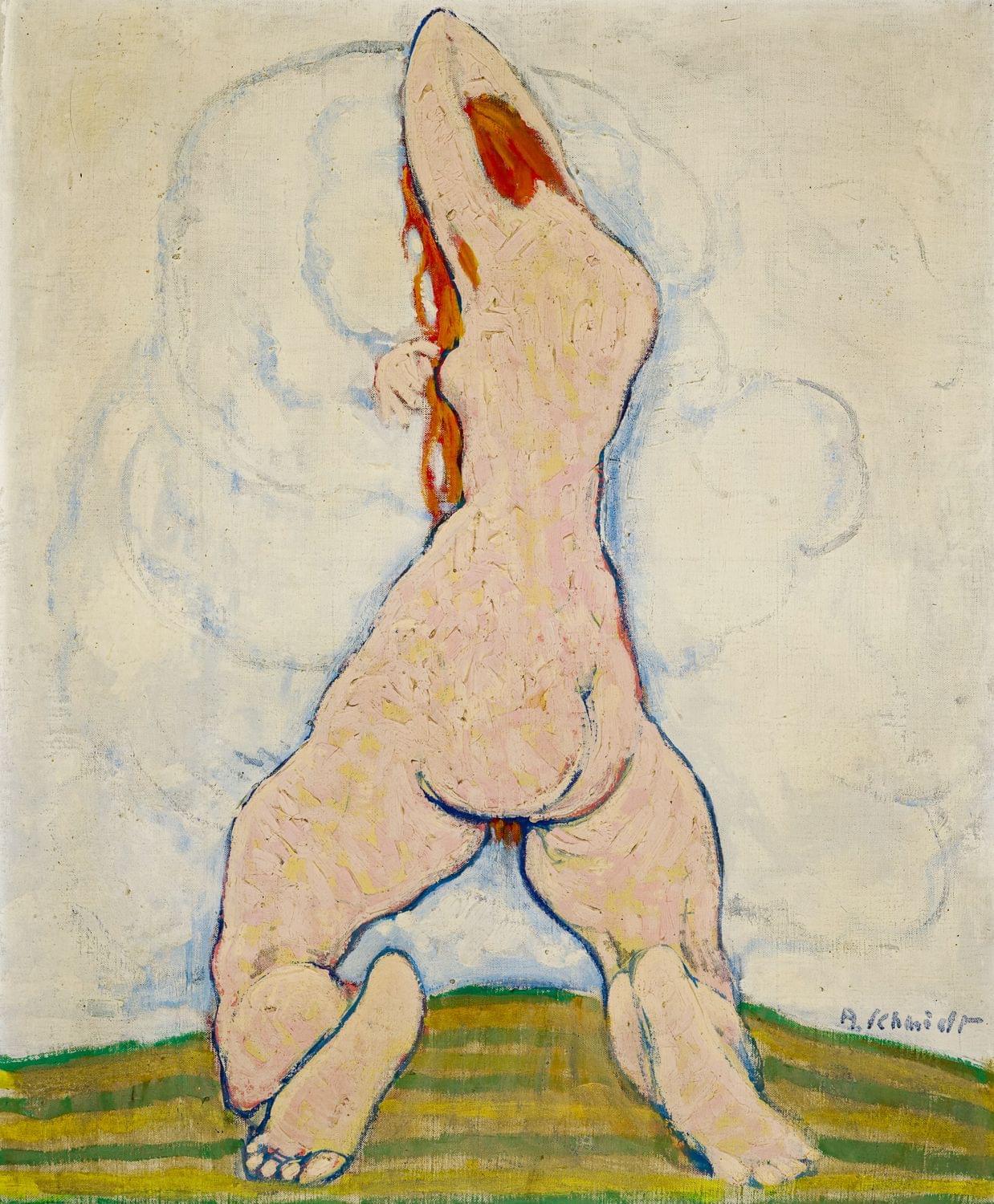 Femme rousse agenouillée, huile sur toile, signée, 64x52,5 cm. Ce nu pourrait être une allégorie du Cervin au soleil couchant. La position du modèle dans les nuées et ses cheveux roux sur le côté reproduisent en effet la forme et l’effet des rayons du soleil sur la montagne iconique de la Suisse en fin de journée depuis Zermatt. Le peintre a réalisé plusieurs études connues de cette composition, notamment une aquarelle datée « 8 jan 1916 » et vendue chez Sotheby’s, vente du 29 novembre 2005, lot 32