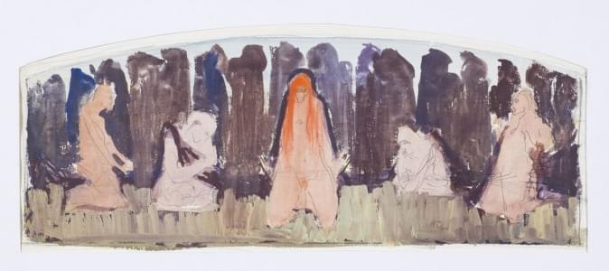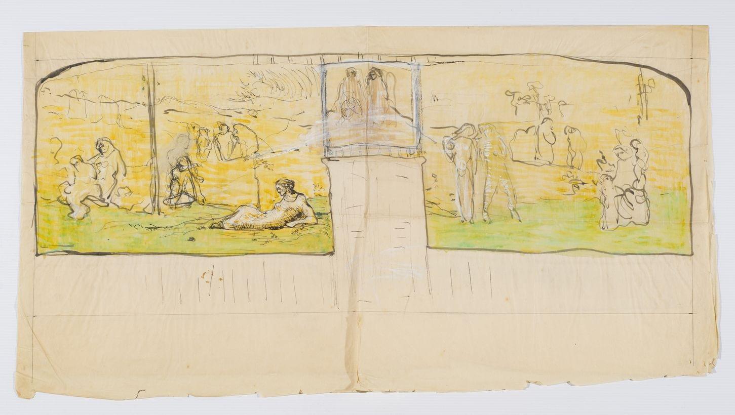 Deux projets de décor figurant des personnages, un dessin préparatoire et un nu féminin assis, gouache, encre, aquarelle et mine de plomb sur papier, 24x43,5 et 82x80 cm