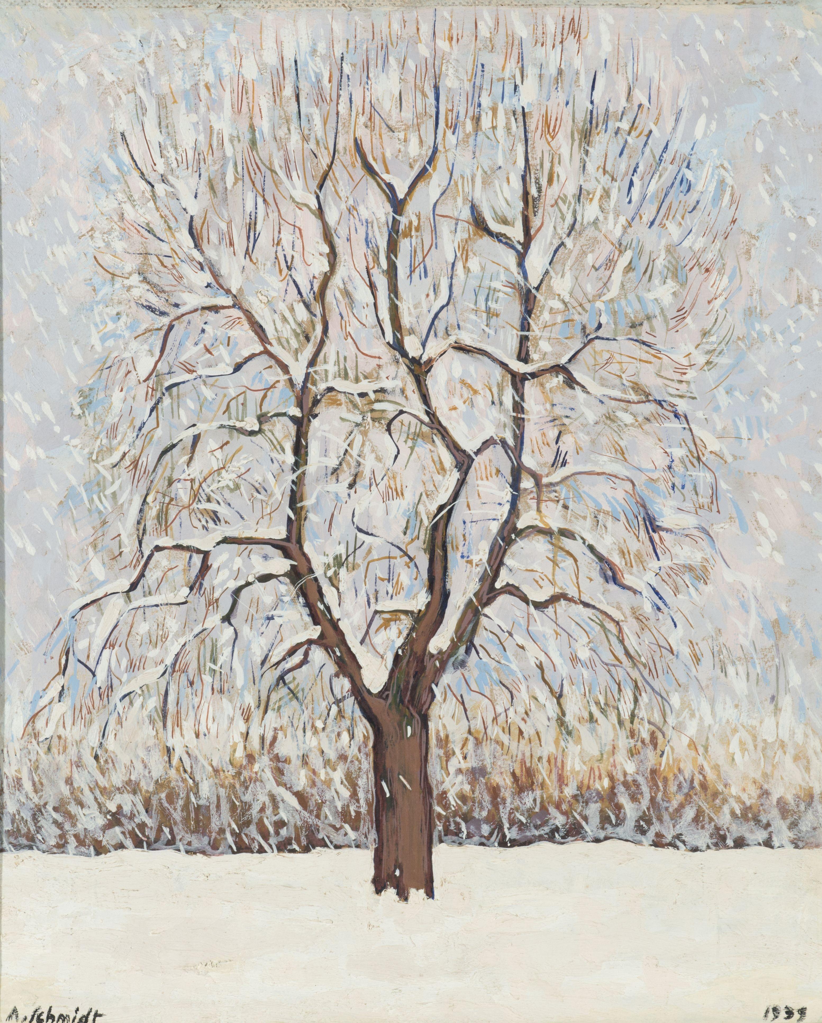 Il neige, huile sur pavatex, signée, datée 1939 et titrée au dos, 49x40 cm
