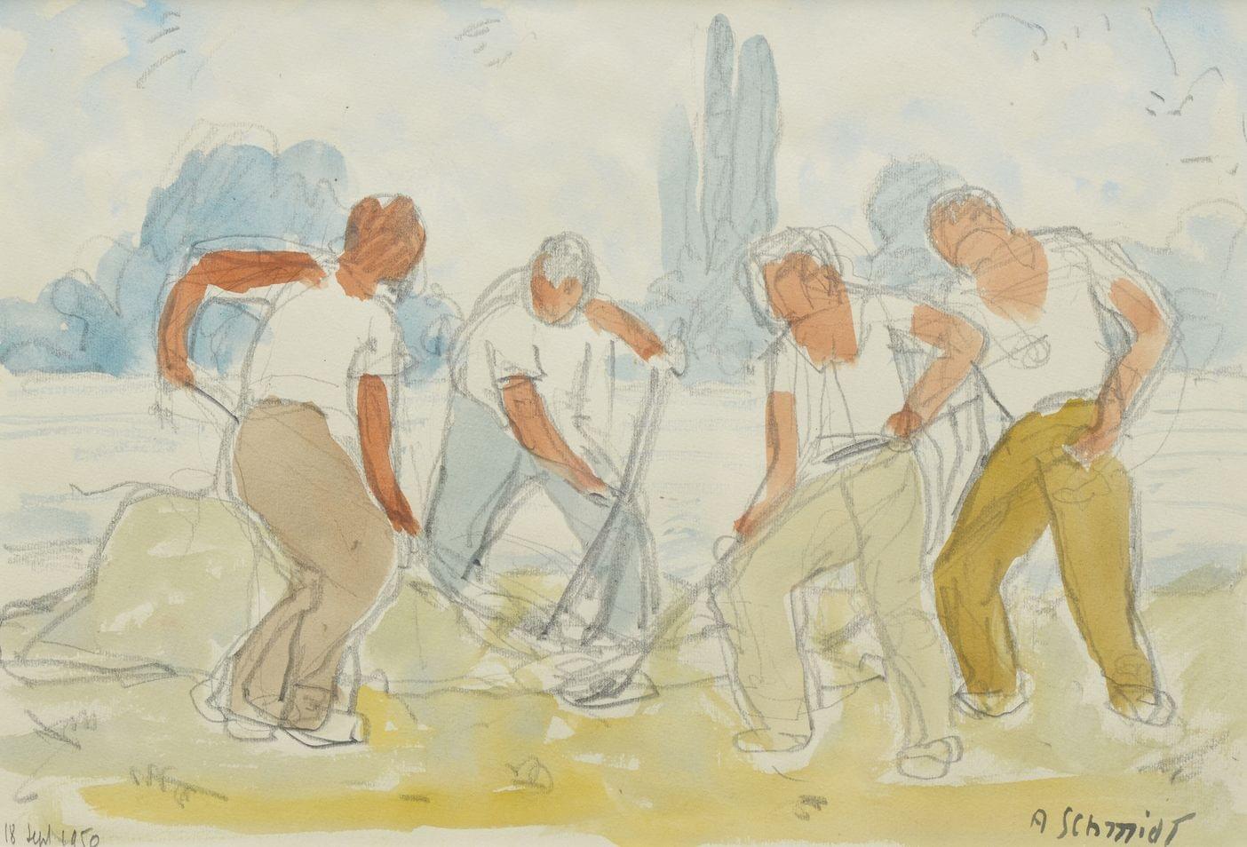Ouvriers au travail, aquarelle sur papier signée 27 juin 50, 20x...