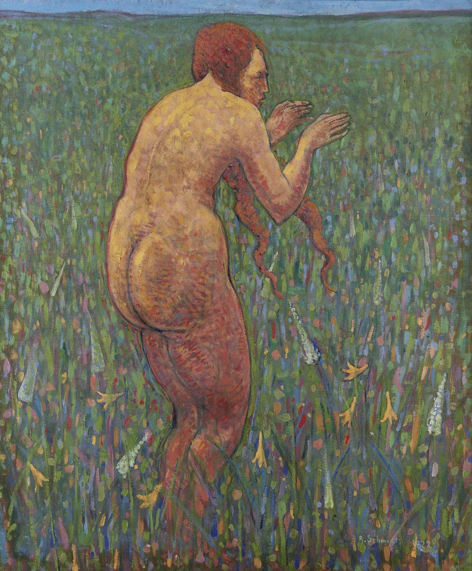 Nu féminin dans une prairie fleurie, huile sur toile, signée et datée 1922, 130x108 cm