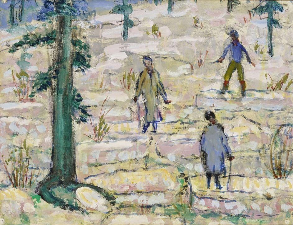 Les promeneurs dans la forêt, huile sur papier marouflé, cachet de l'atelier, 44x58 cm
