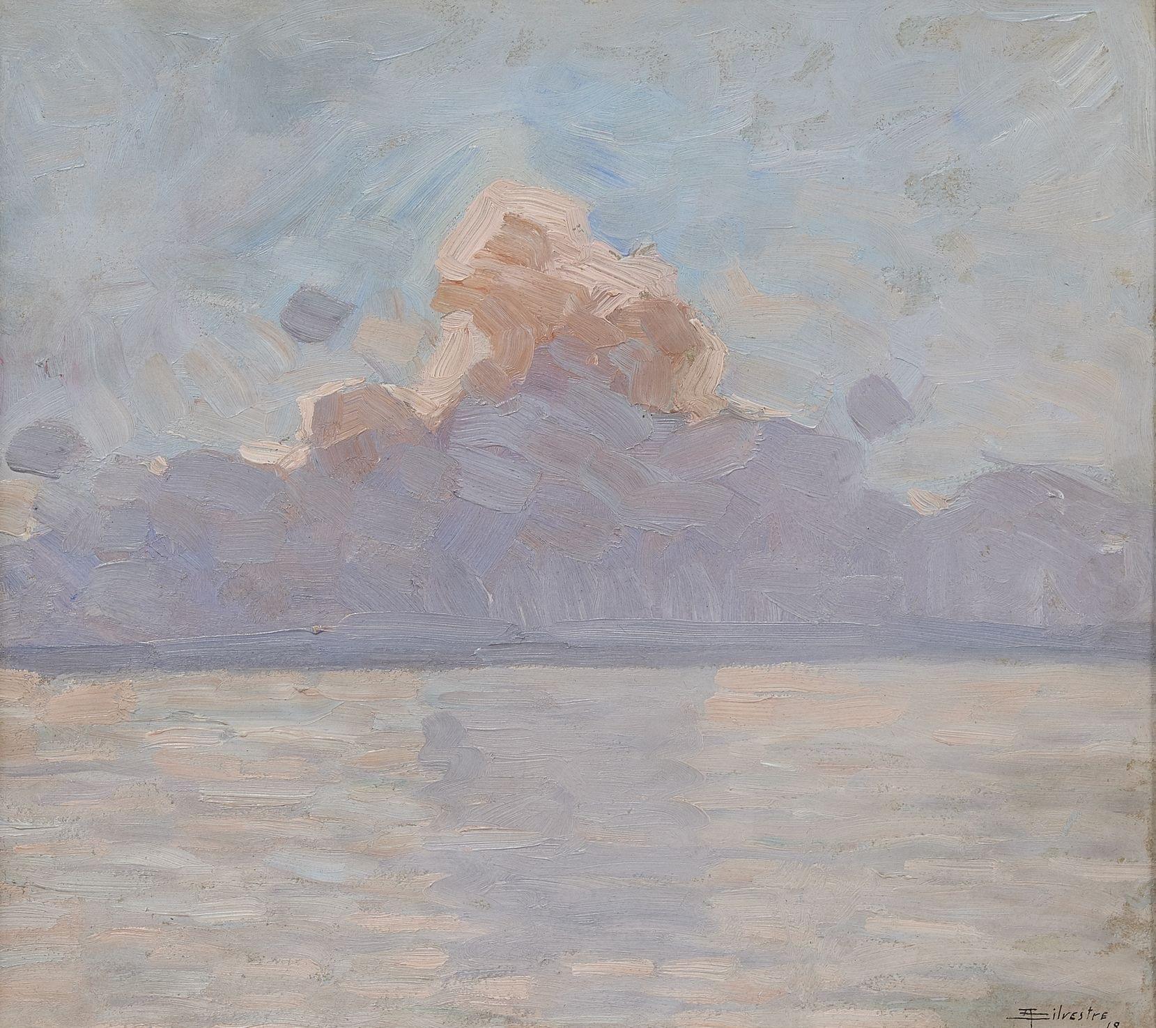 Nuage rose sur le lac, huile sur carton, signée, 34x38,5 cm