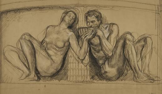 Pan et une nymphe, fusain, signé, 32x56 cm