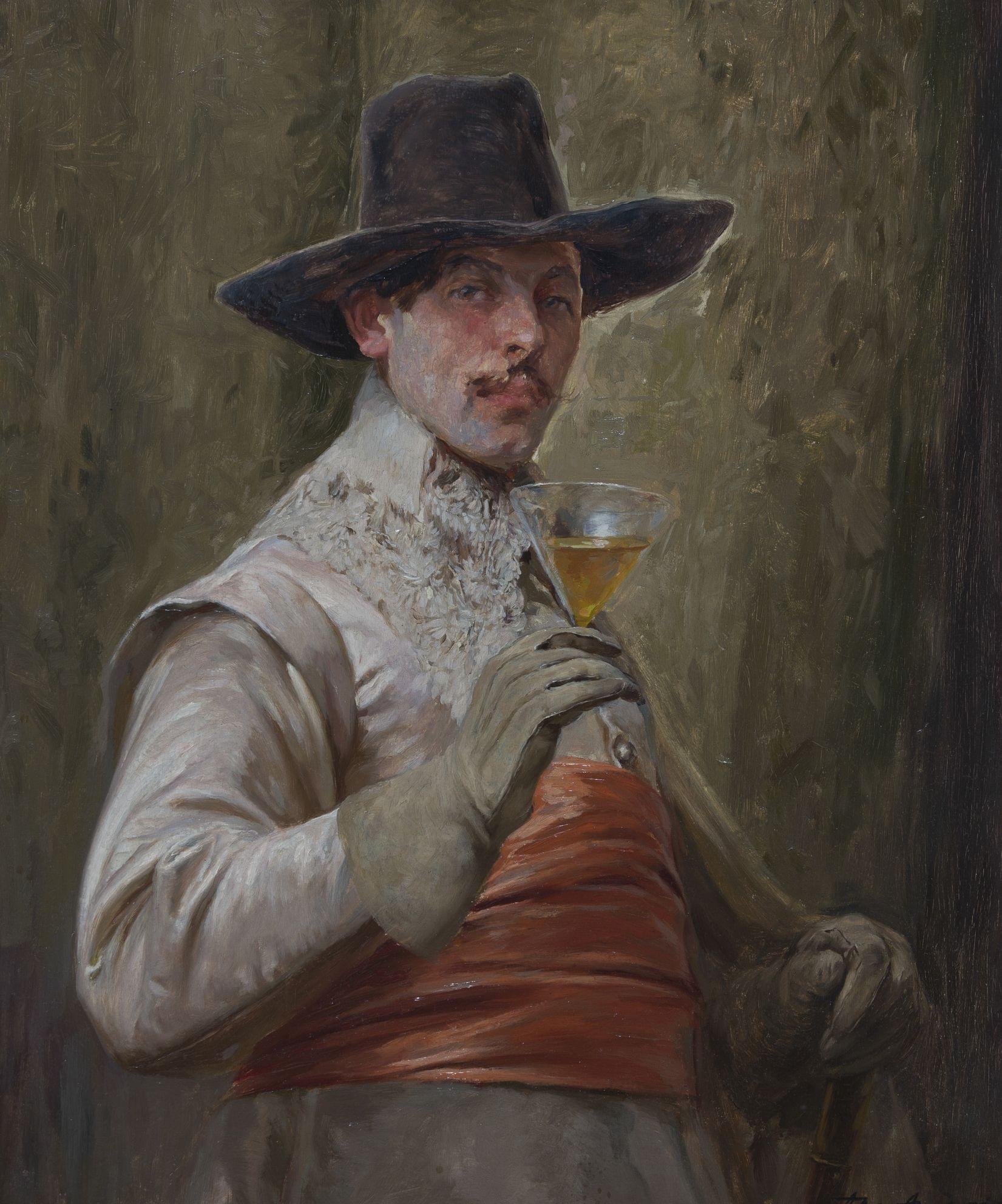 Mousquetaire au verre de vin, huile sur panneau, signée, 46x37 cm