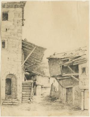 Ruelle de village, mine de plomb signée, 26x20 cm