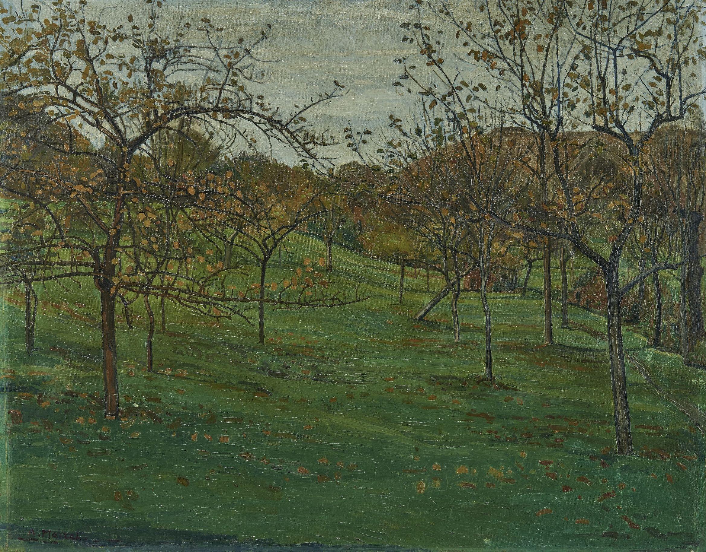 Automne, huile sur toile, signée, datée 1909 et titrée au dos, 60x75 cm
