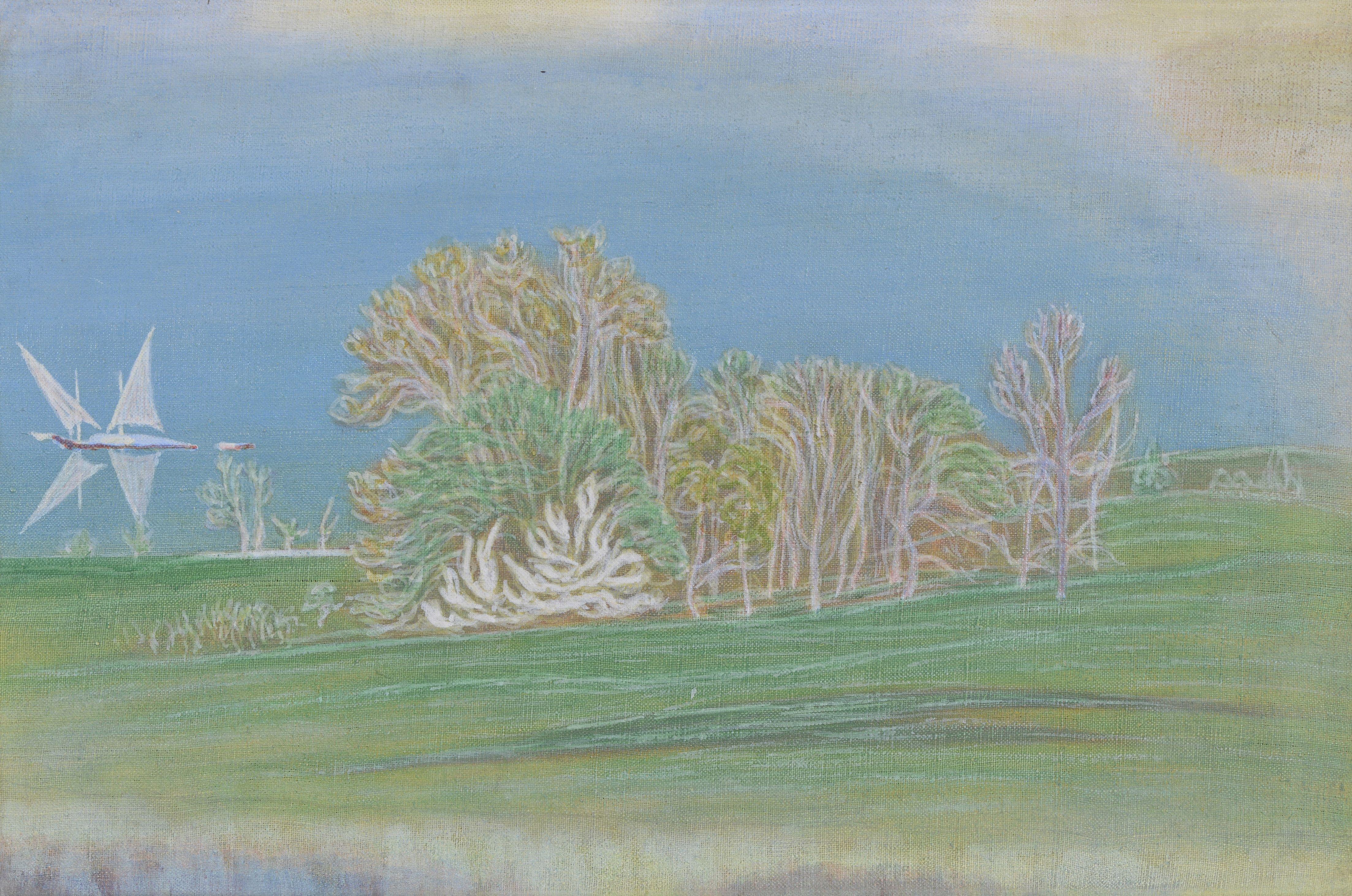 Eglise et arc-en-ciel, gouache sur papier signée, 27x35cm.
