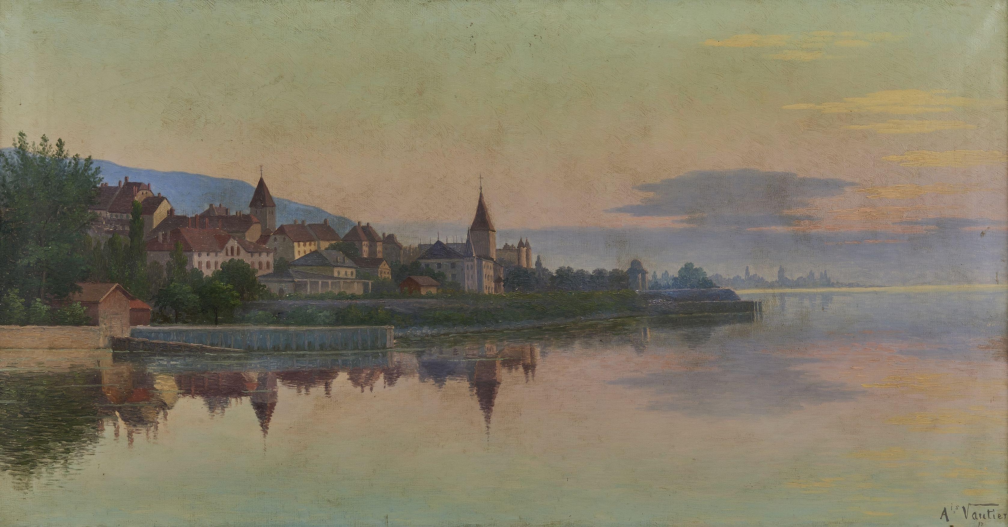 Grandson, le lac de Neuchâtel avec le Jura en arrière-plan, huile sur toile, signée, 62x116 cm